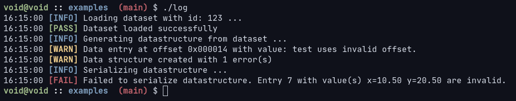 An example demonstrating how to log formatted messages to stdout, while having time prefixes and colorized logging type prefixes: