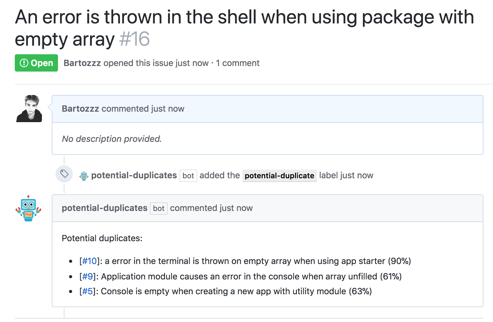 $ npm startYou need to install our Github App. You can deploy our Github App manually. Then, you can create a custom configuration file at .github/potential-duplicates.yml. If this file doesn't exists, default settings will be used: