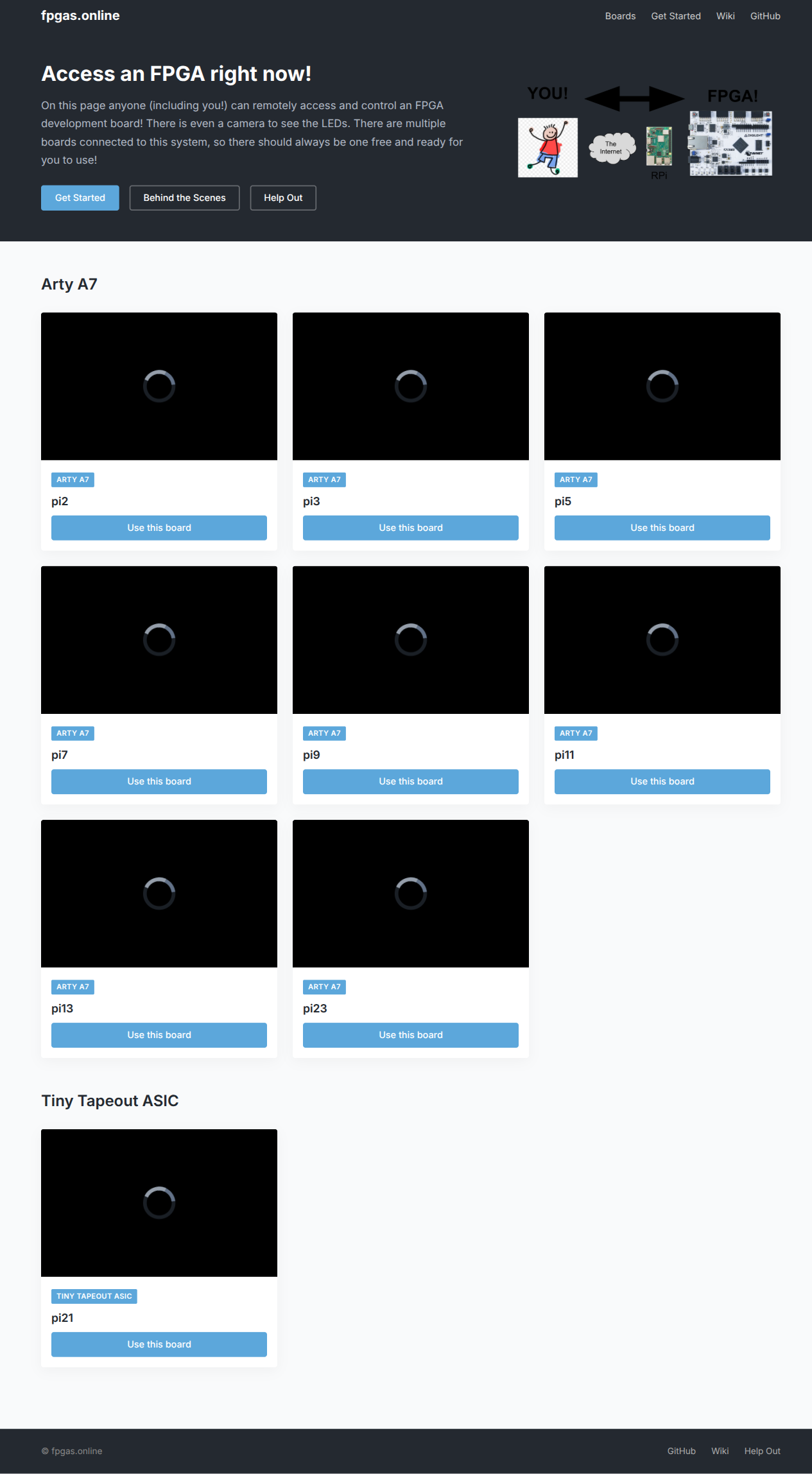board_typefield to Pi model with choices (Arty A7, NeTV2, ULX3S, Fomu, Tiny Tapeout ASIC/FPGA)base.htmlshared template with sticky header, footer, viewport meta (fixes mobile)make serve)Screenshots