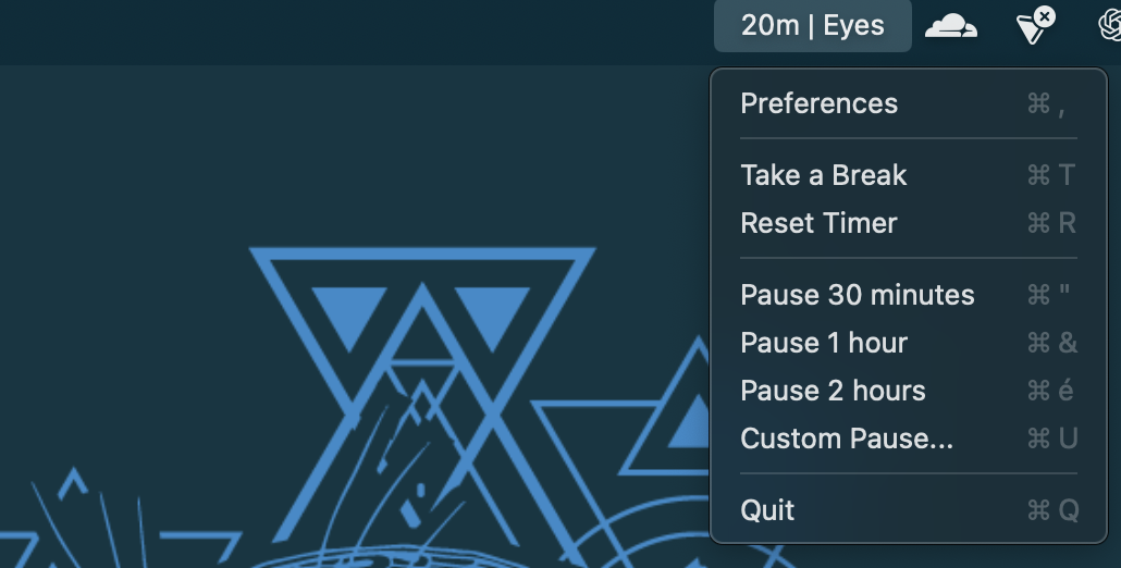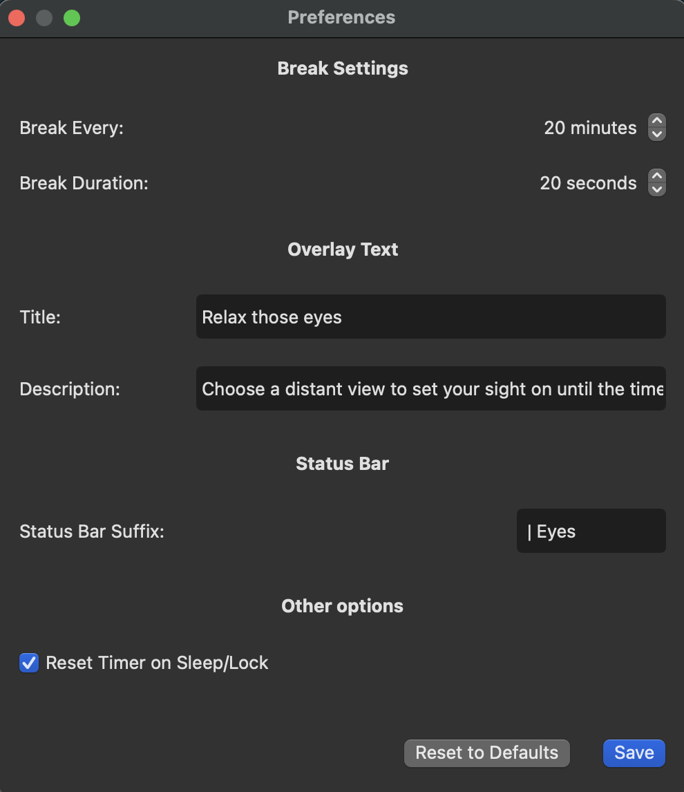 - Preferences: Use the Preferences panel (accessible from the status bar menu) to change break intervals, durations, overlay texts, and more.