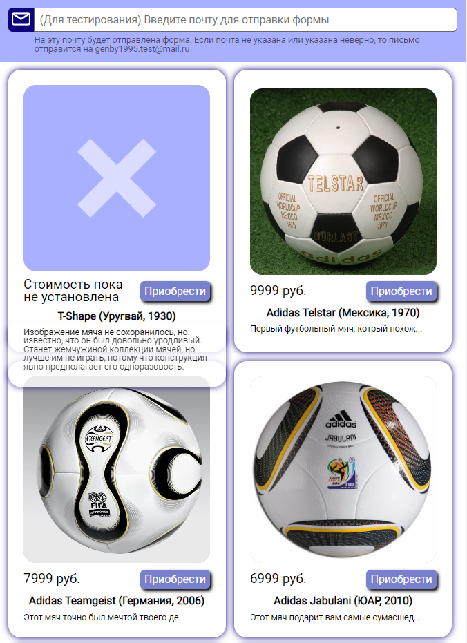 Лэндинг с карточками товаров, подгружаемых из базы, с отправкой информации посетителя на почту (тестовое задание для ООО "ВебБустер").