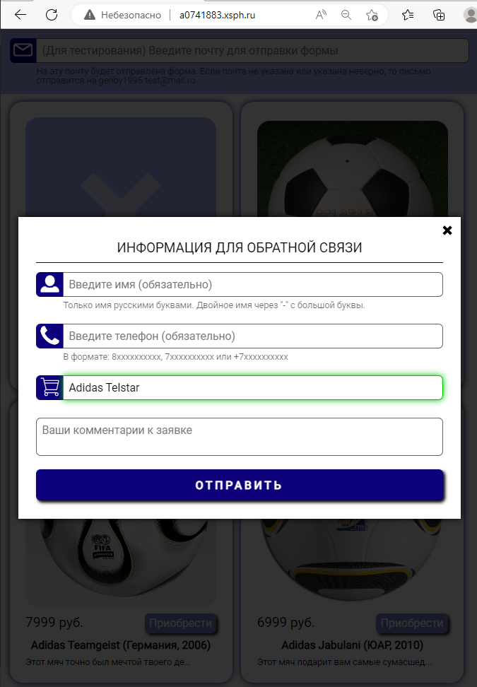 - при нажатии на кнопке "Приобрести" открывается модальное окно формы для заполнения контактной информации посетителя и желаемого им товара. Название товара вводится в соответвтсвующий INPUT автоматически.