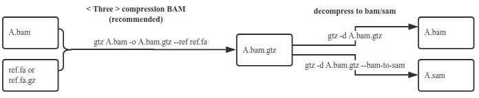 Using the-donot-pack-ref option, the resulting target gtz file is smaller, but the corresponding fasta needs to be specified when unzipping. We do not recommend using this option because without this option, the compression ratio has little effectcompared to this option, but if you use this option, you need to specify the appropriate fasta when unzipping and you have to ensure the fasta is properly saved in safe disk.