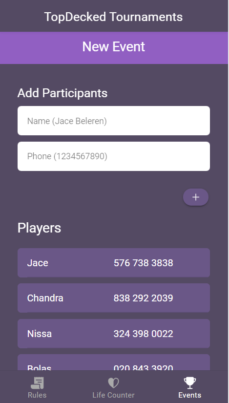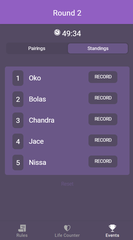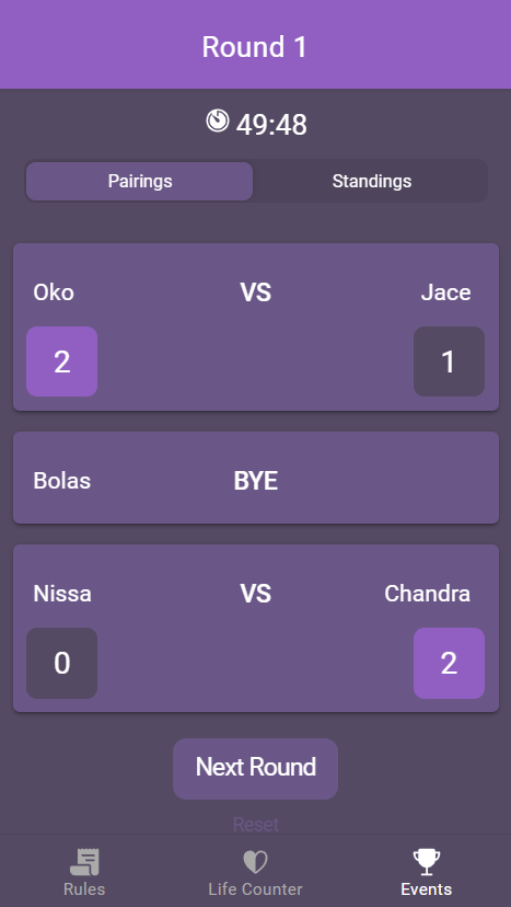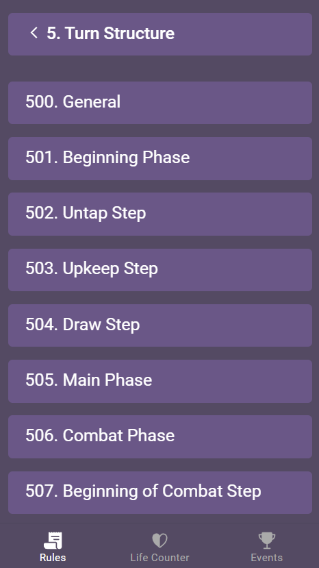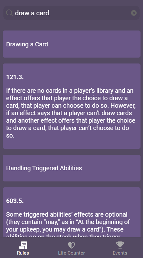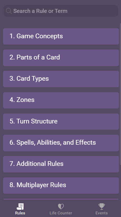 This repository includes a full rules search engine and term glossary, a swiss-style tournament system with smart pairings, and a heavily customizable life tracker with round timer, history, and more!