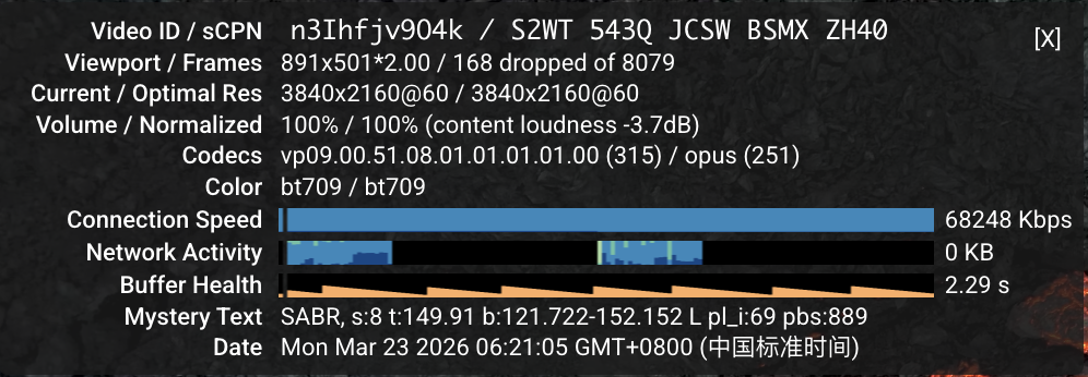 观看YouTube(4k@60) ,流畅无卡顿,截图如下:
