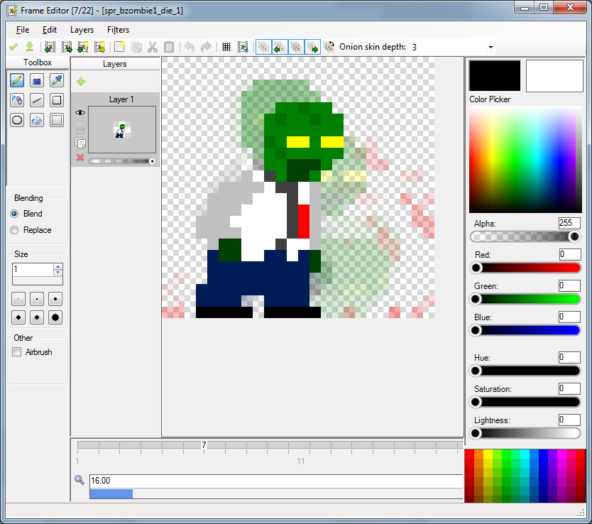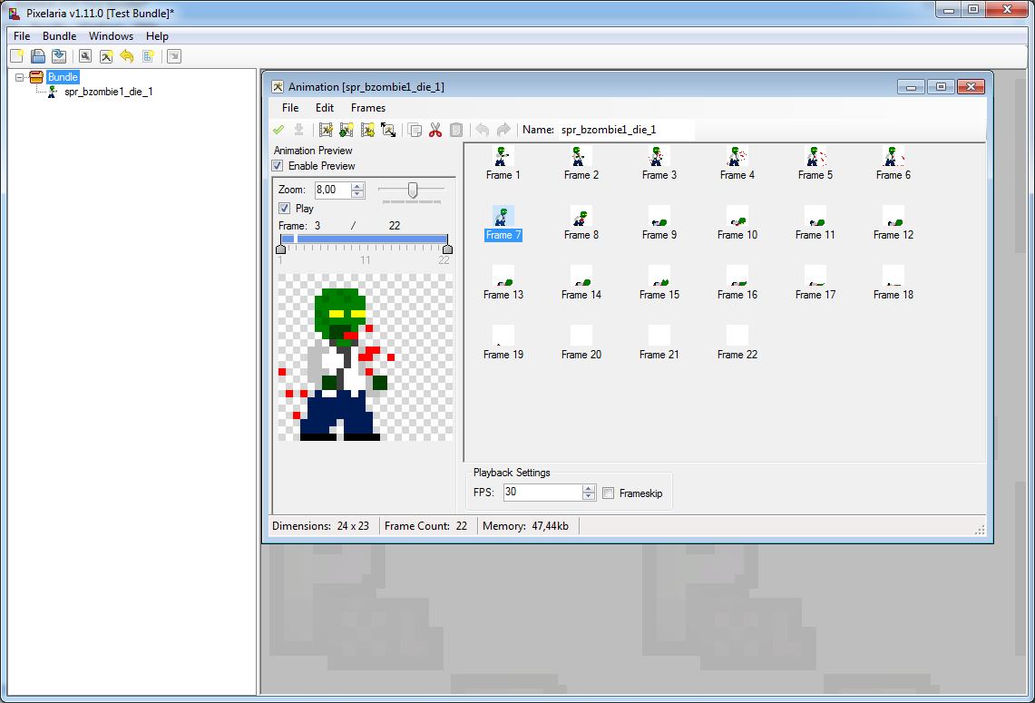 Pixelaria Software for creating and exporting pixel-art animations. The program also handles importing and grouping of animations. The program is entirely writen in .NET C# 4.5 and has no external library dependencies. Main interface with an animation opened Frame editor showing an onion skin The rest of the screenshots can be viewed here.