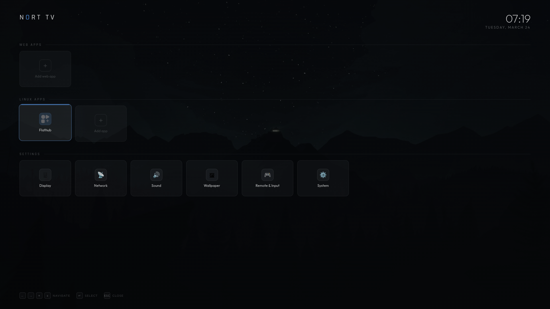 A fullscreen TV UI for Linux. Runs on Ubuntu Server, Debian, Raspberry Pi OS Lite, and Arch Linux. Boots straight to a big-screen interface — no desktop environment needed.