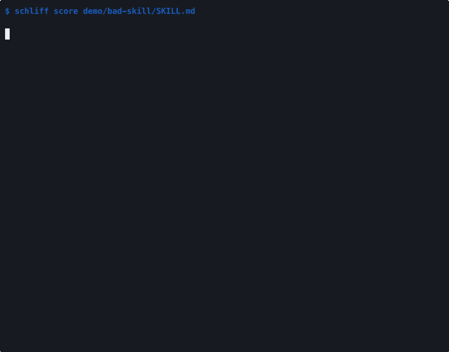schliff score path/to/SKILL.mdDeterministic static analysis. No LLM required. Same input, same output, every time.