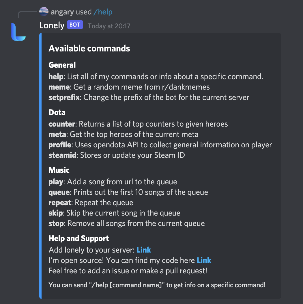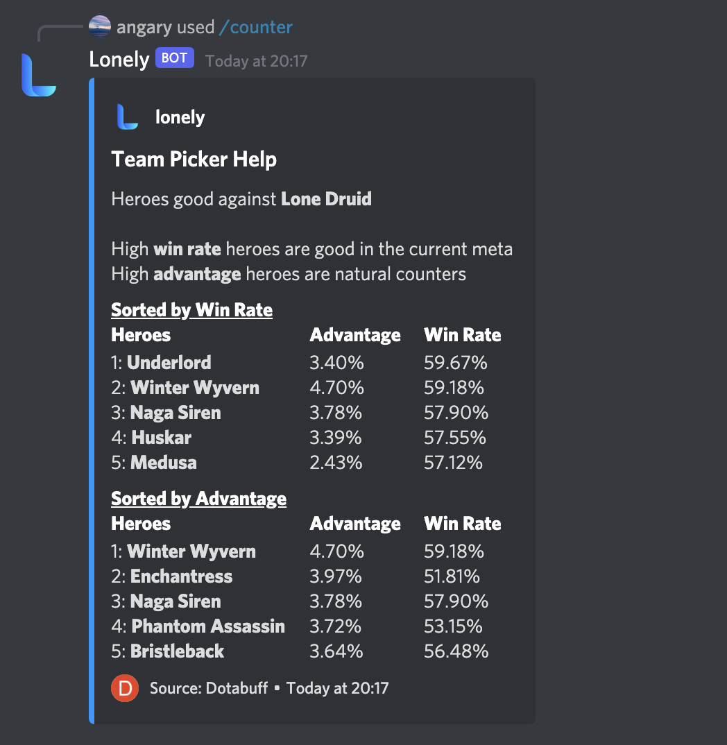 - The bot is named lonely bot after Lone Druid a Dota 2 hero who I spam too much.