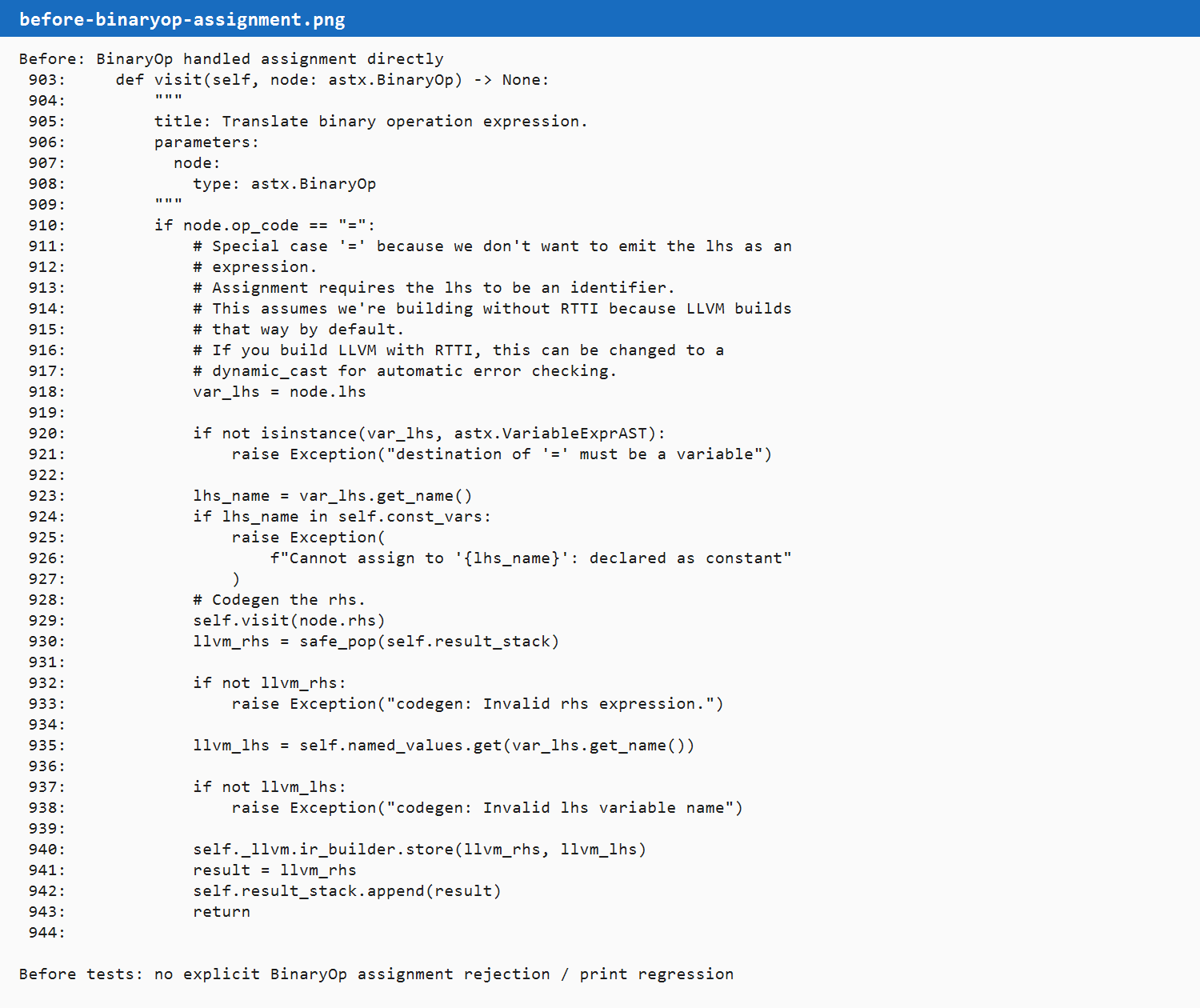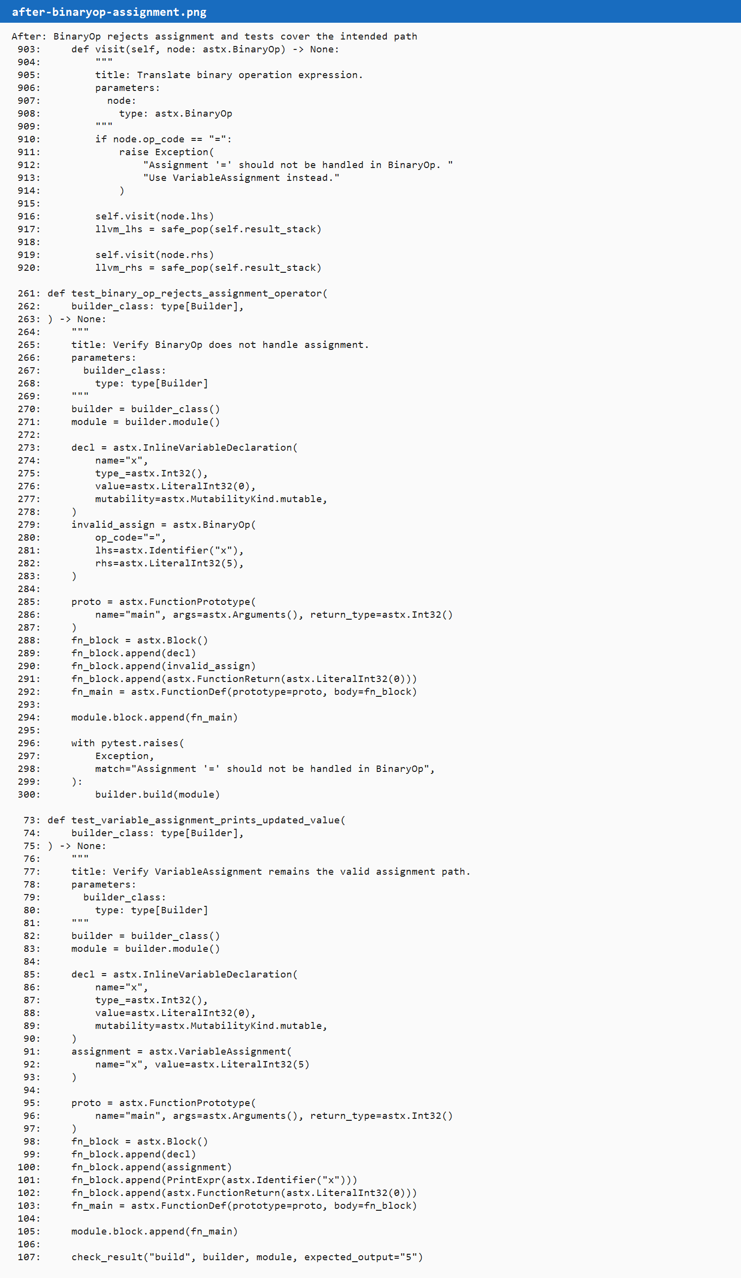 BinaryOp("=")guard is intentional to prevent duplicated codegen paths and preserve the intended language design.Checklist: