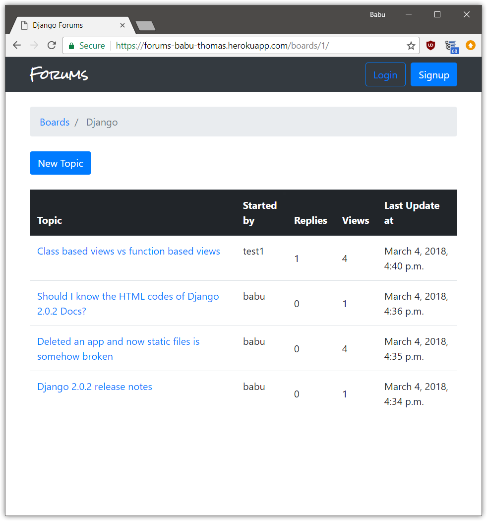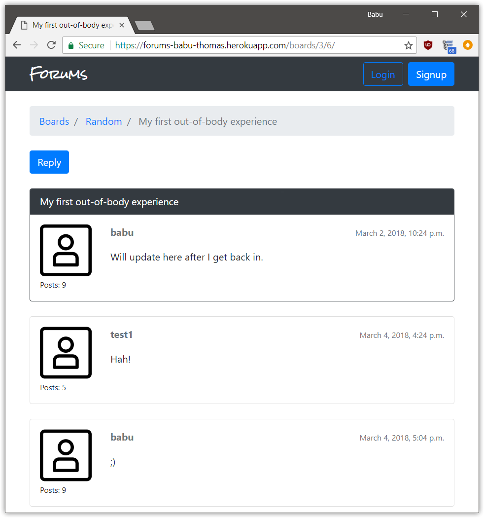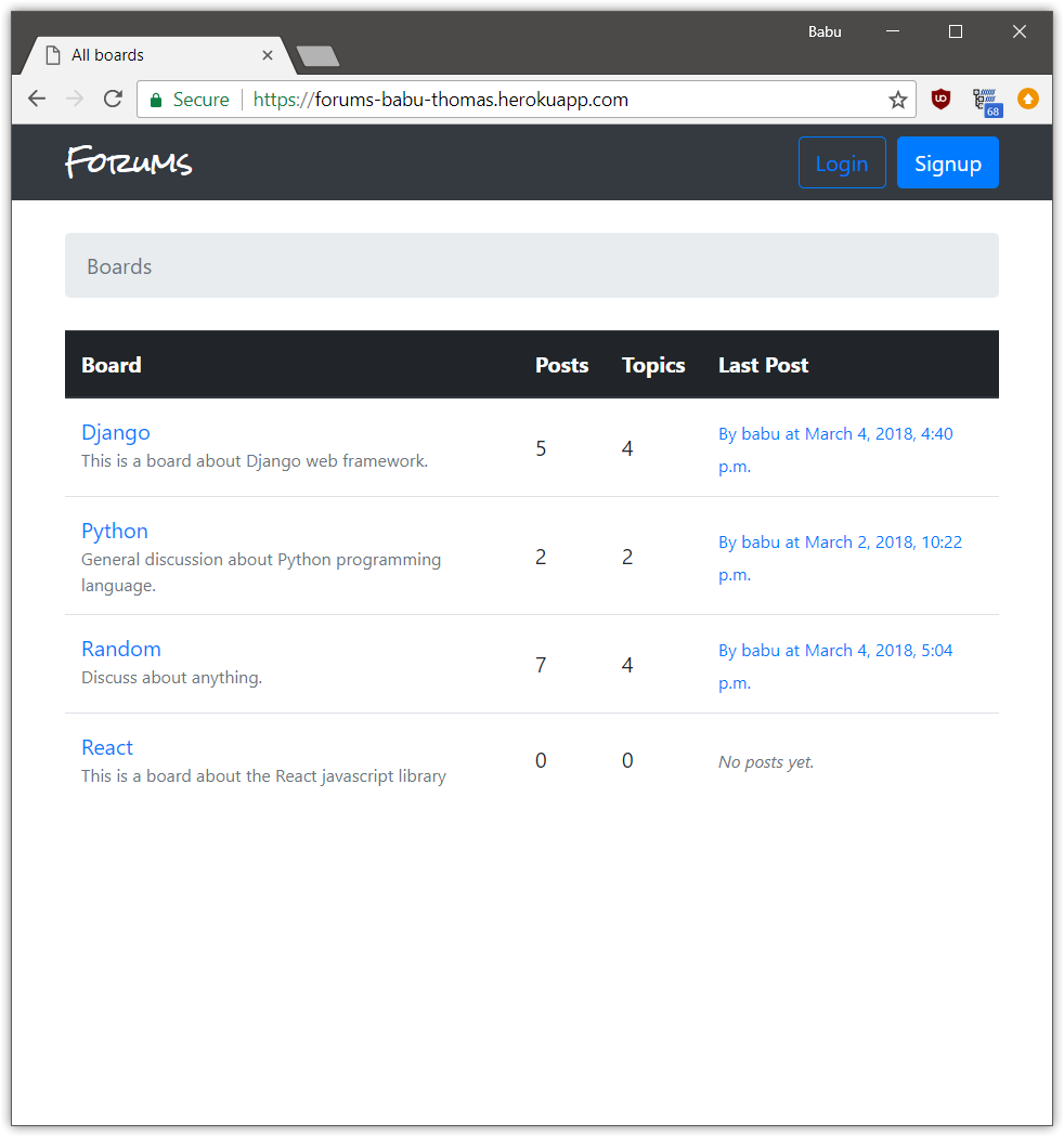 A discussion forum site made using Django. Different boards for different topics are present. Users can sign up, post topics and reply to different topics.