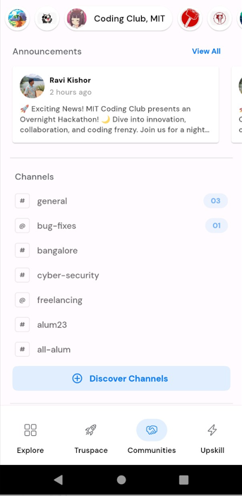 Communities Page: Connecting alumni and students through dynamic posts, chats, reactions, and comments, fostering engagement and nostalgia in global and club-specific communities.