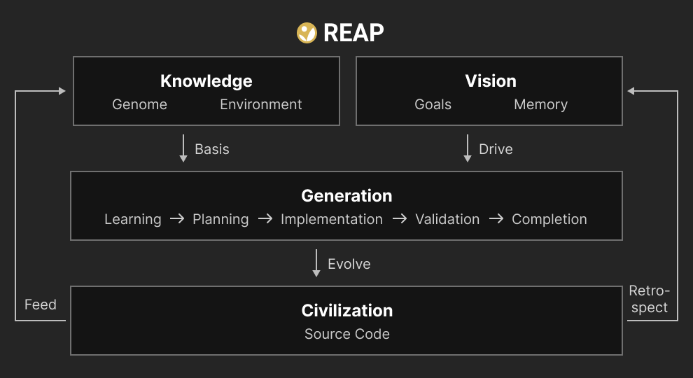 REAP is a generation-based development pipeline where AI and humans collaborate to build and evolve software. The human provides vision and makes key decisions. The AI learns the project's knowledge — Genome (architecture, conventions, constraints) and Environment (codebase, dependencies, domain) — then works through structured generations to implement, verify, and adapt. Each completed generation feeds lessons back into the knowledge base. Over time, both the knowledge and the source code (Civilization) self-evolve.