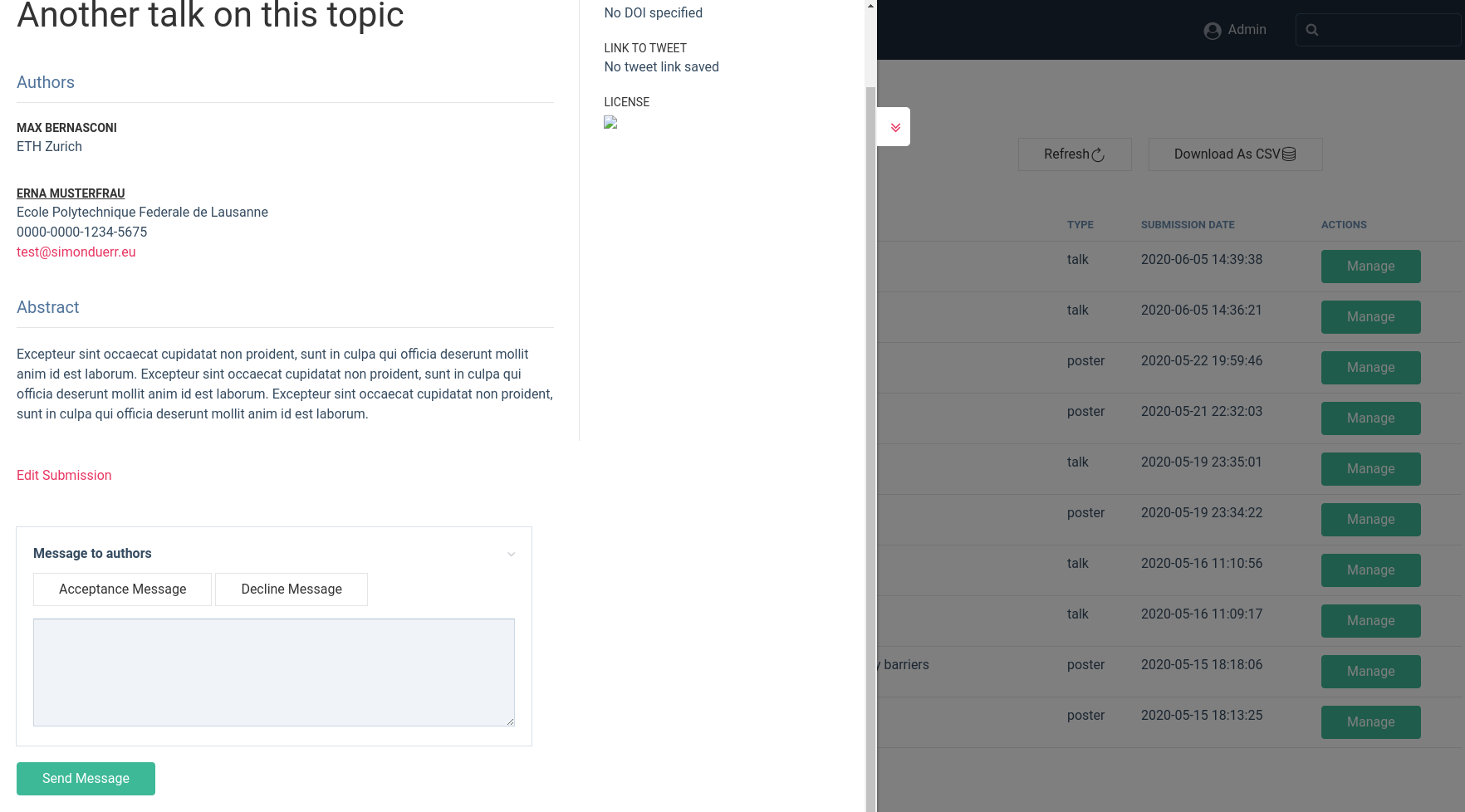 After the deadline is over (also a setting), abstracts can no longer be submitted. Users will be notified of the deadline when signing up. Then you can use the Manage Submissions Tab in the admin to view the submissions. You then have to go through all submissions and either accept or decline them. Message templates can be prefilled in the settings for quick and convenient processing of the abstracts. The particpants are sent an email upon acceptance/decline.