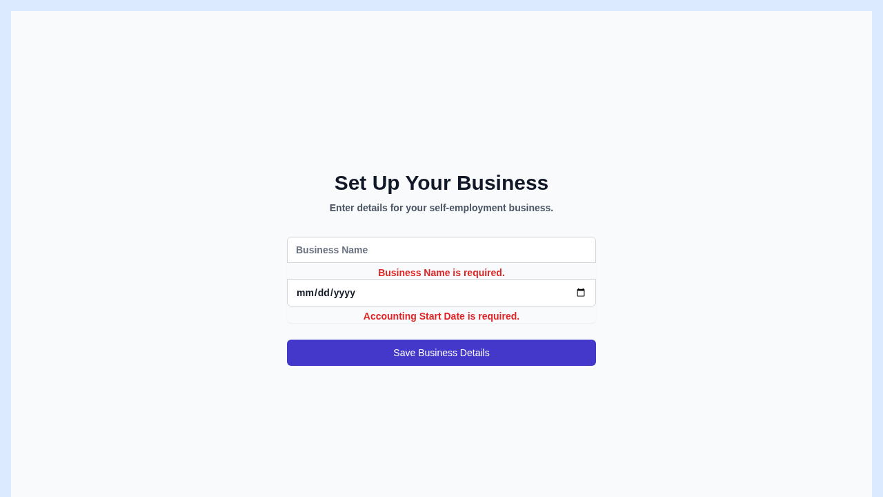 This screenshot captures the "Set Up Your Business" form. It highlights the required fields "Business Name" and "Accounting Start Date" with clear validation messages, ensuring users provide essential information for their self-employment business.