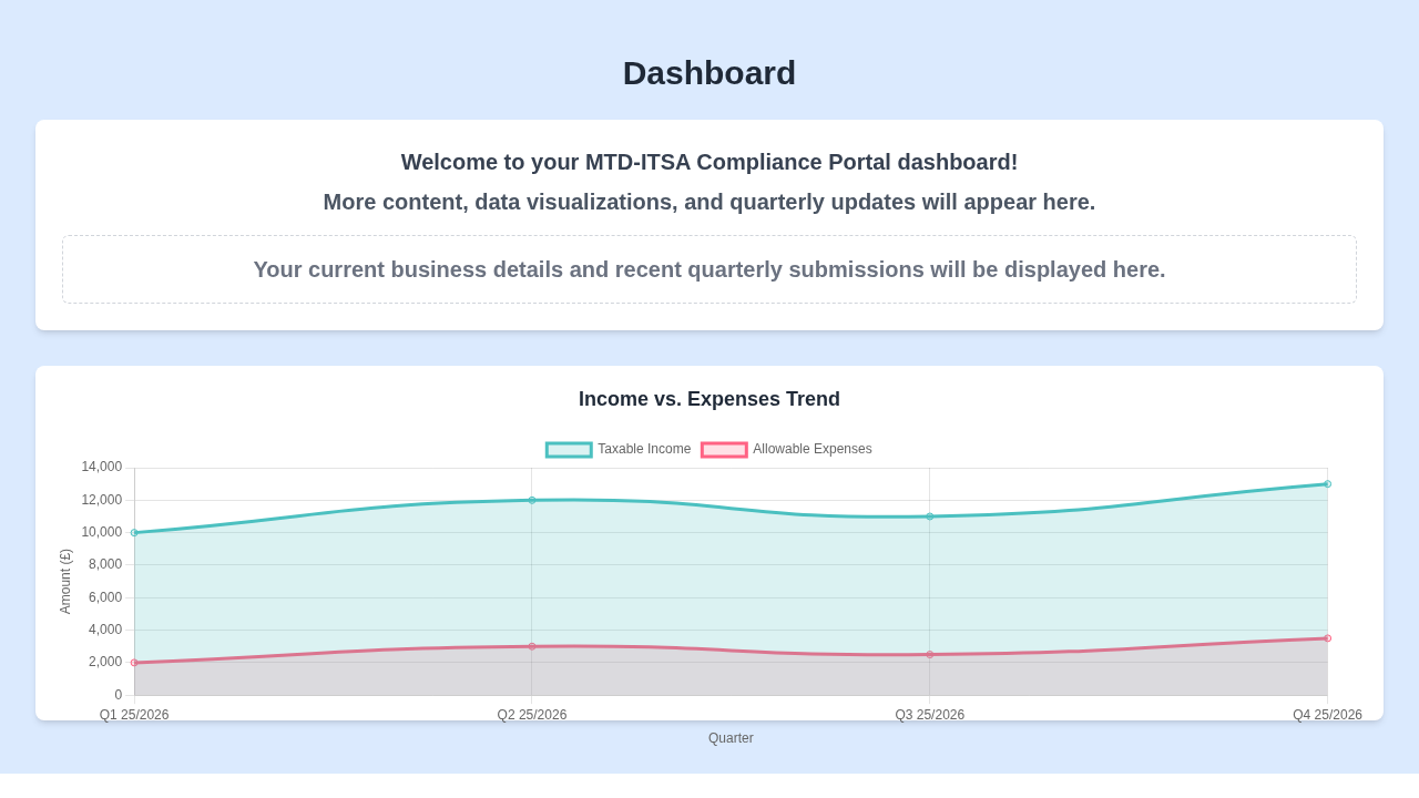 This image presents the main dashboard of the MTD-ITSA Compliance Portal. It welcomes the user and features an "Income vs. Expenses Trend" chart, providing a clear and engaging visualization of key financial data over time.