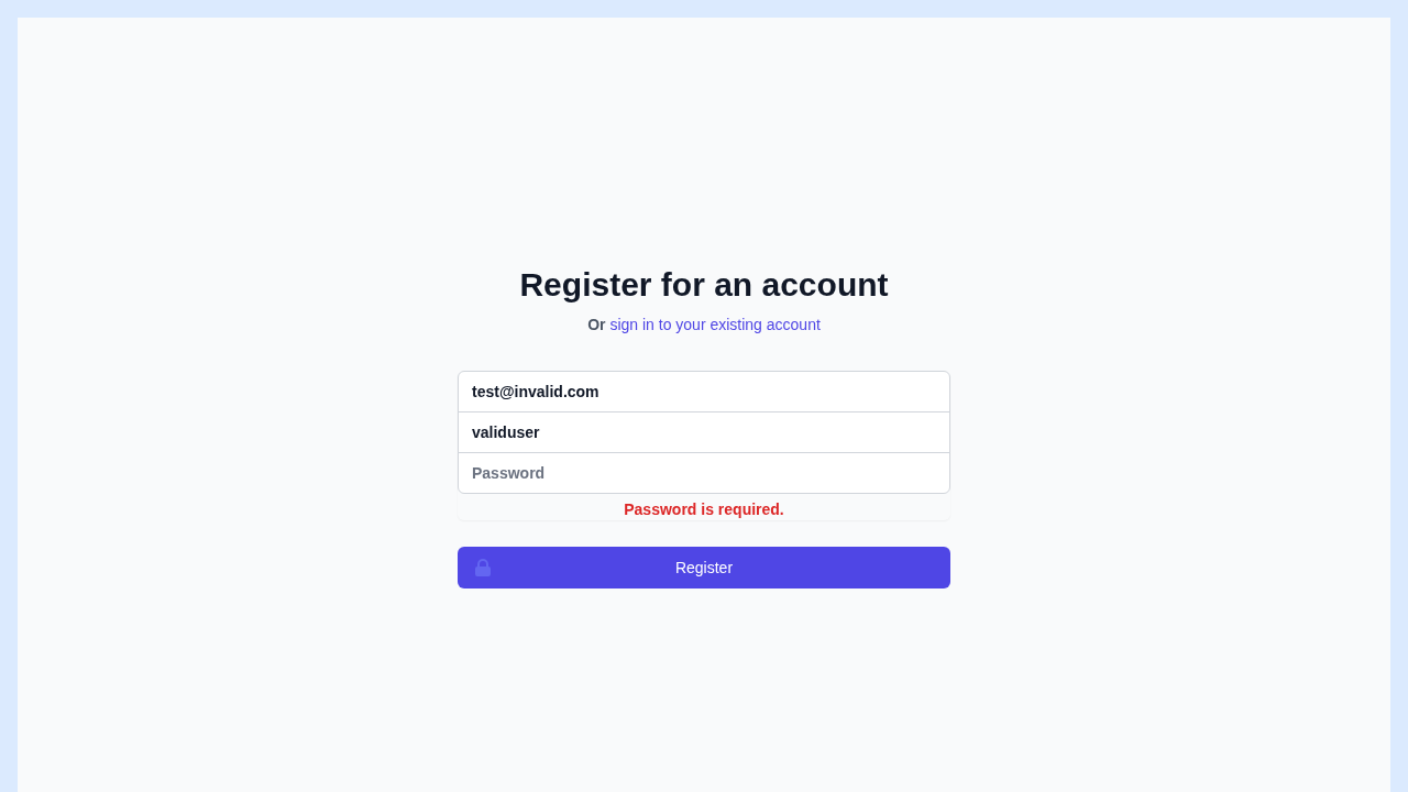 This image displays the user registration form, complete with input fields for email, username, and password. It demonstrates the application's client-side validation, showing a "Password is required" message when the field is left empty.