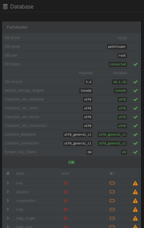 When done, reload the dashboard page and check if both databases are green! - DB connection is established, all Tables exist and all the indexes/unique keys/columns/column types and foreign-key-constraints exist.