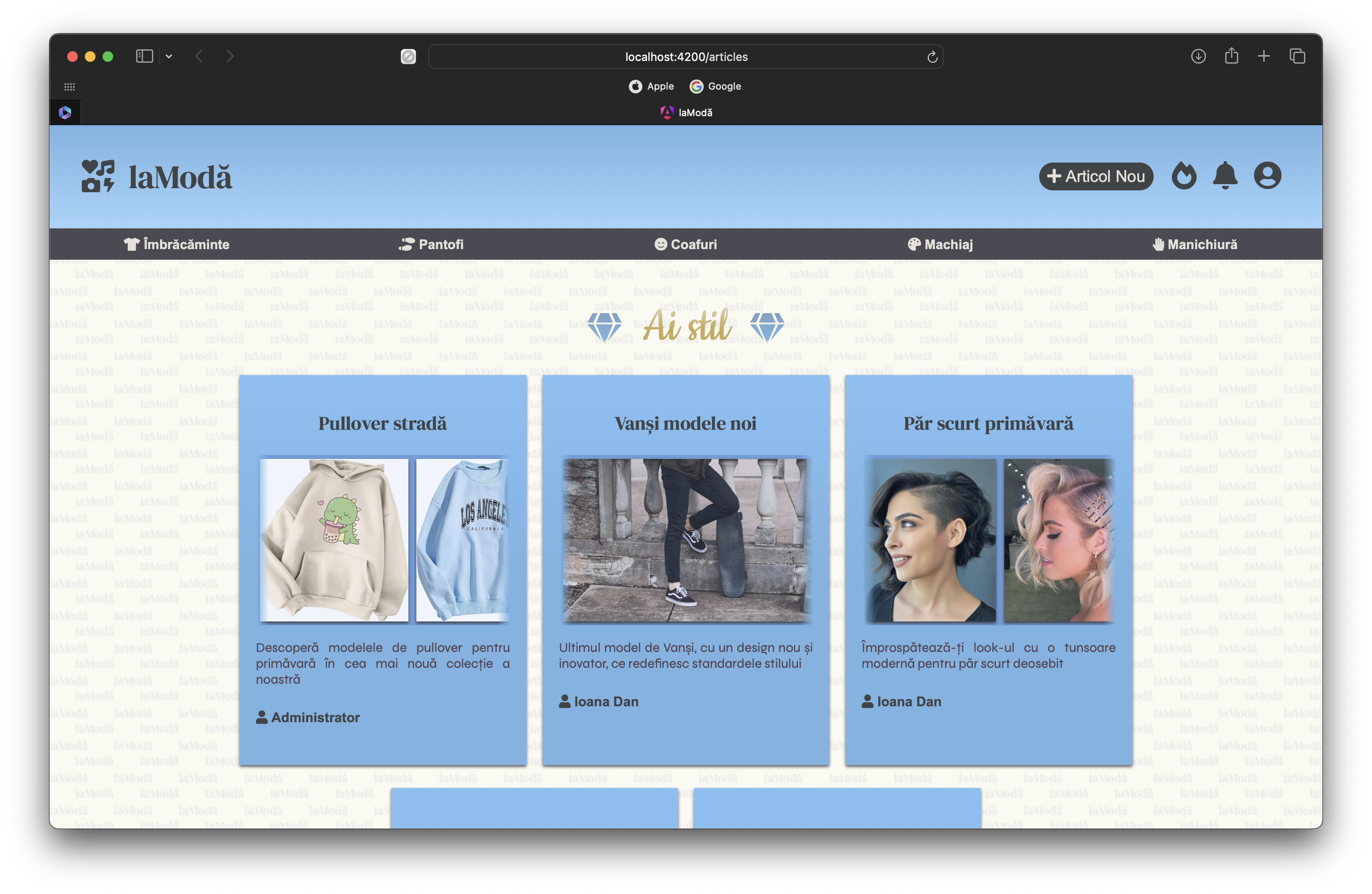 A fictional website (in Romanian) which lets users post articles of their latest in-fashion clothing, make-up, manicure and so on... Front-end is Angular, and back-end is Java Spring.