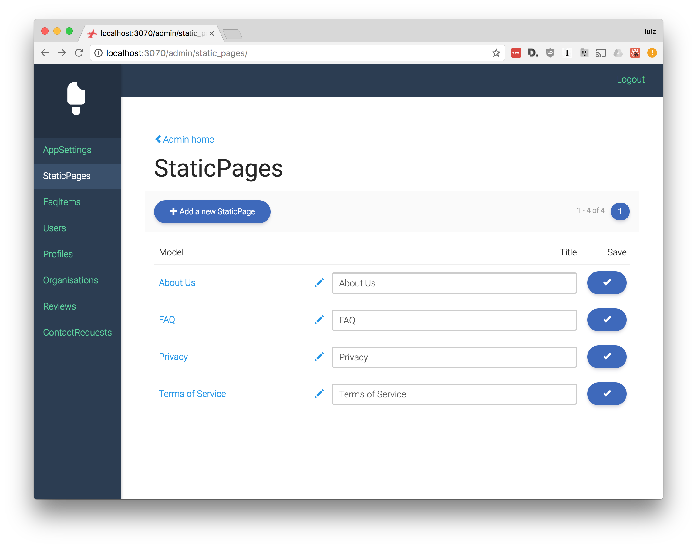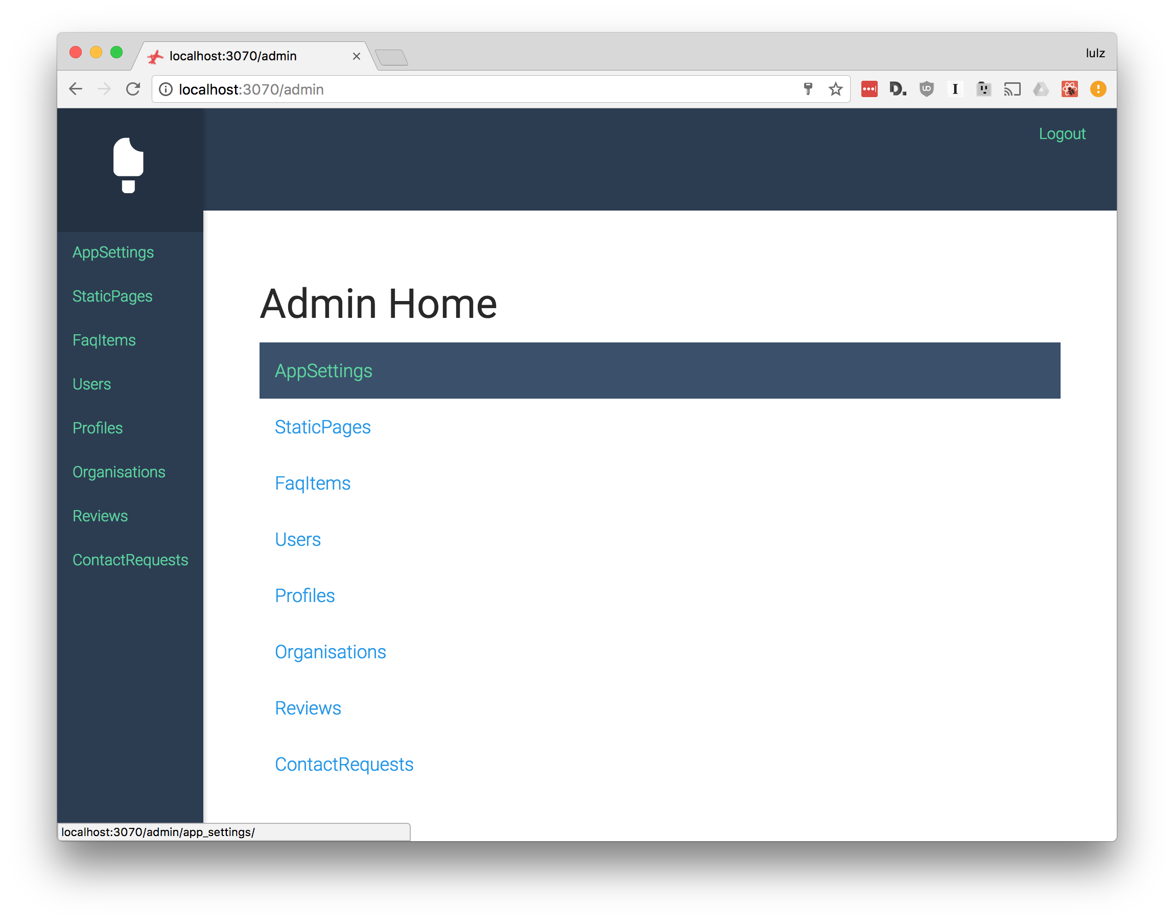 You call configureAdmin and configure the admin with a list of models. It examines each models fields via its schema and generates form fields to edit them. You can pass in some options to control how these form fields are rendered.
