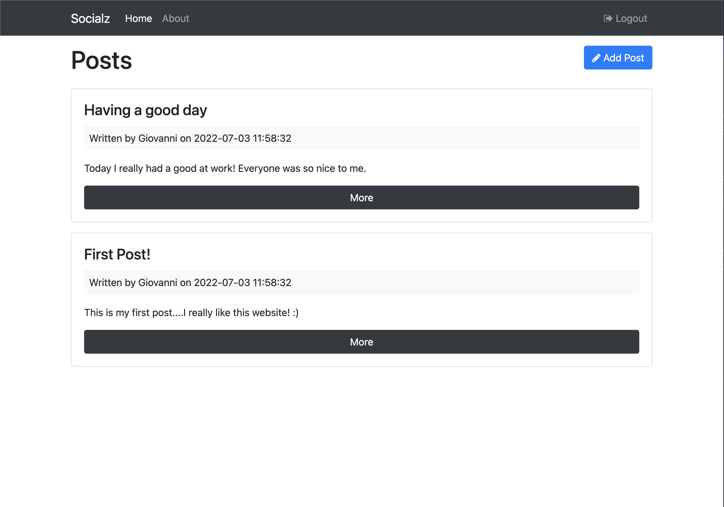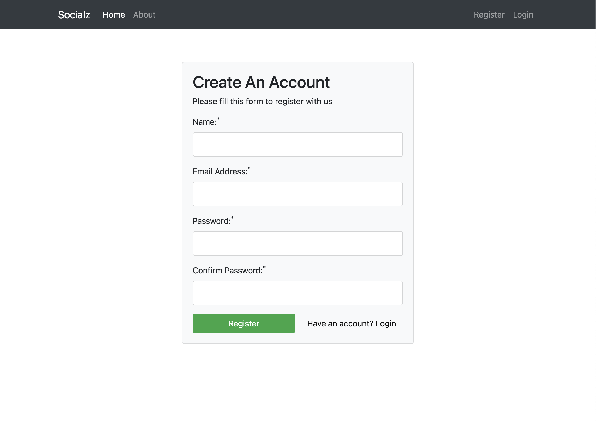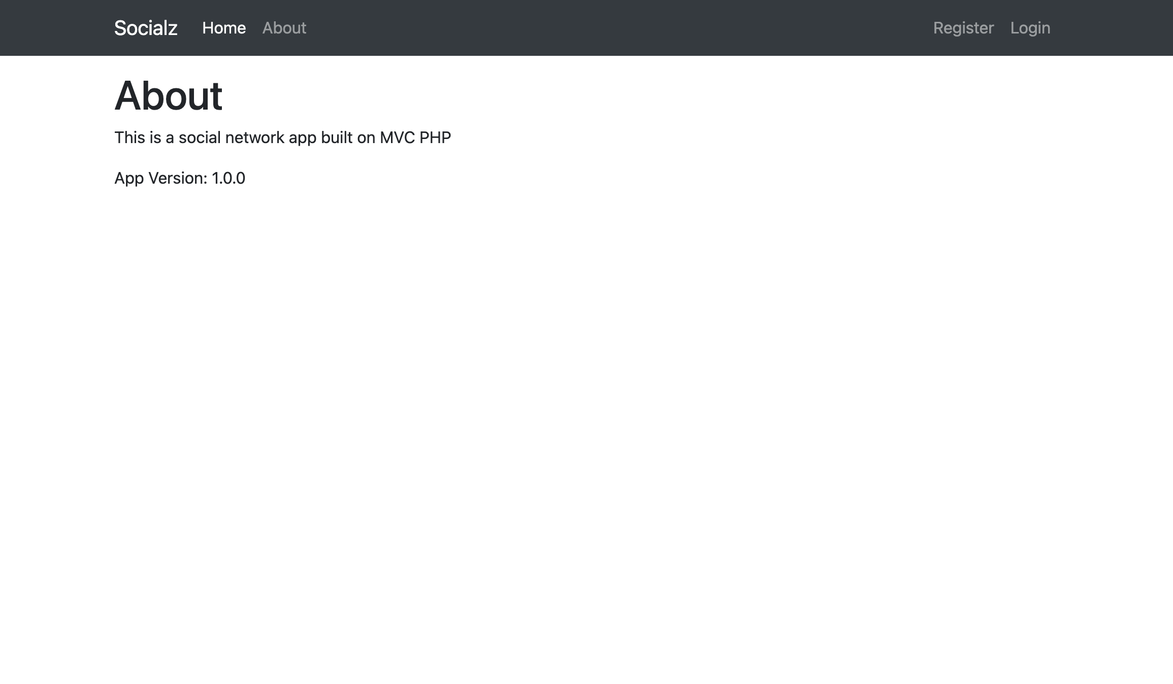 Socialz Simple social network app built with MVC PHP Registration Page Login Page Posts Page Viewing a Post Editing a Post Adding a Post About Page