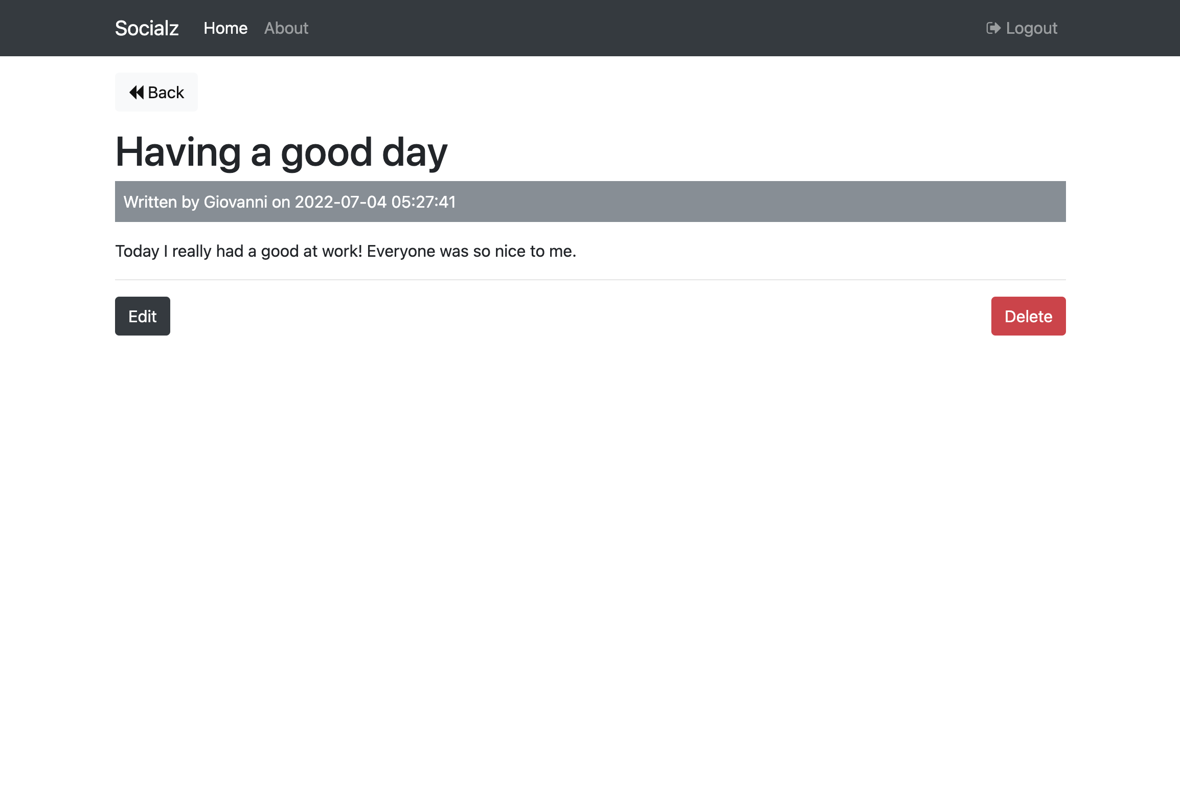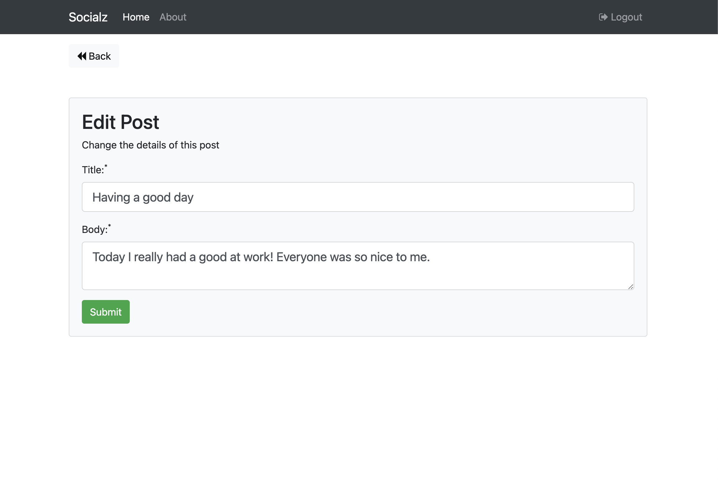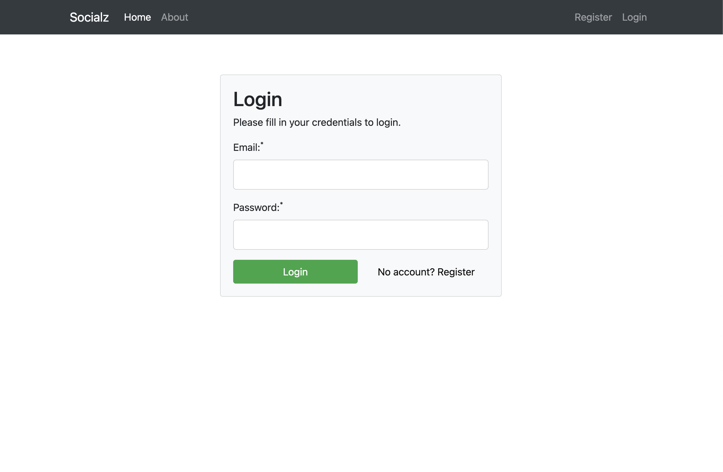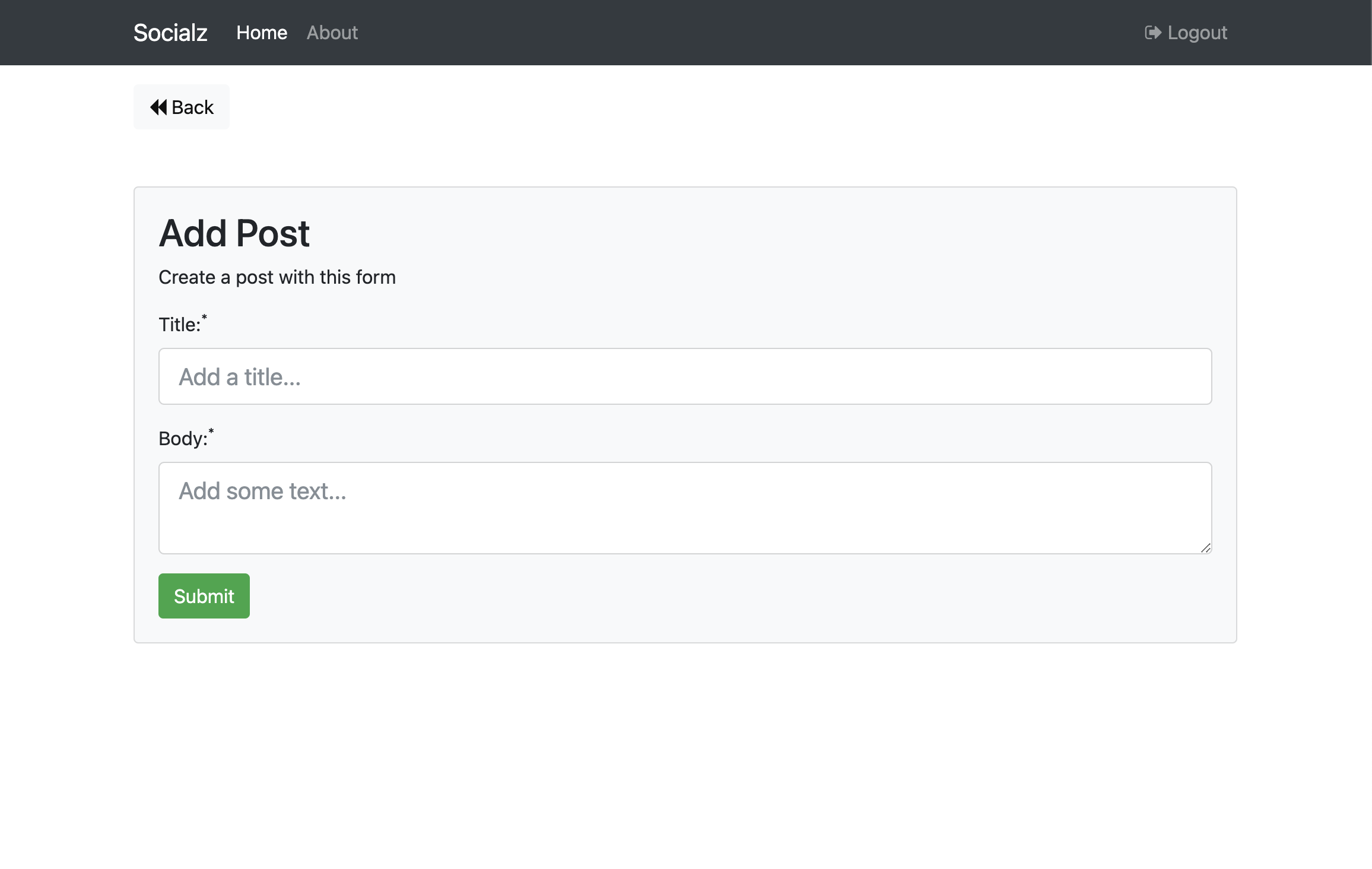 Socialz Simple social network app built with MVC PHP Registration Page Login Page Posts Page Viewing a Post Editing a Post Adding a Post About Page