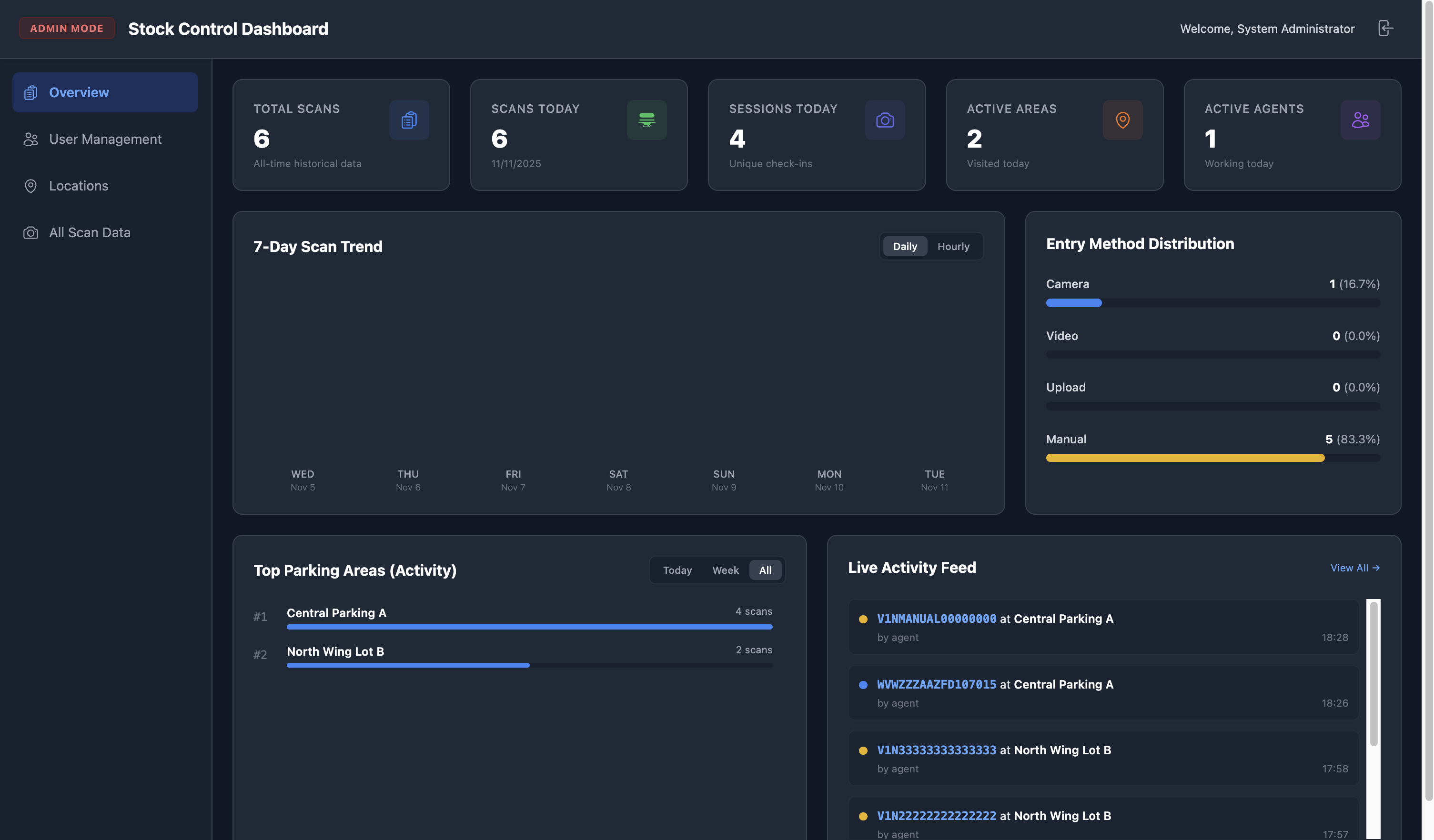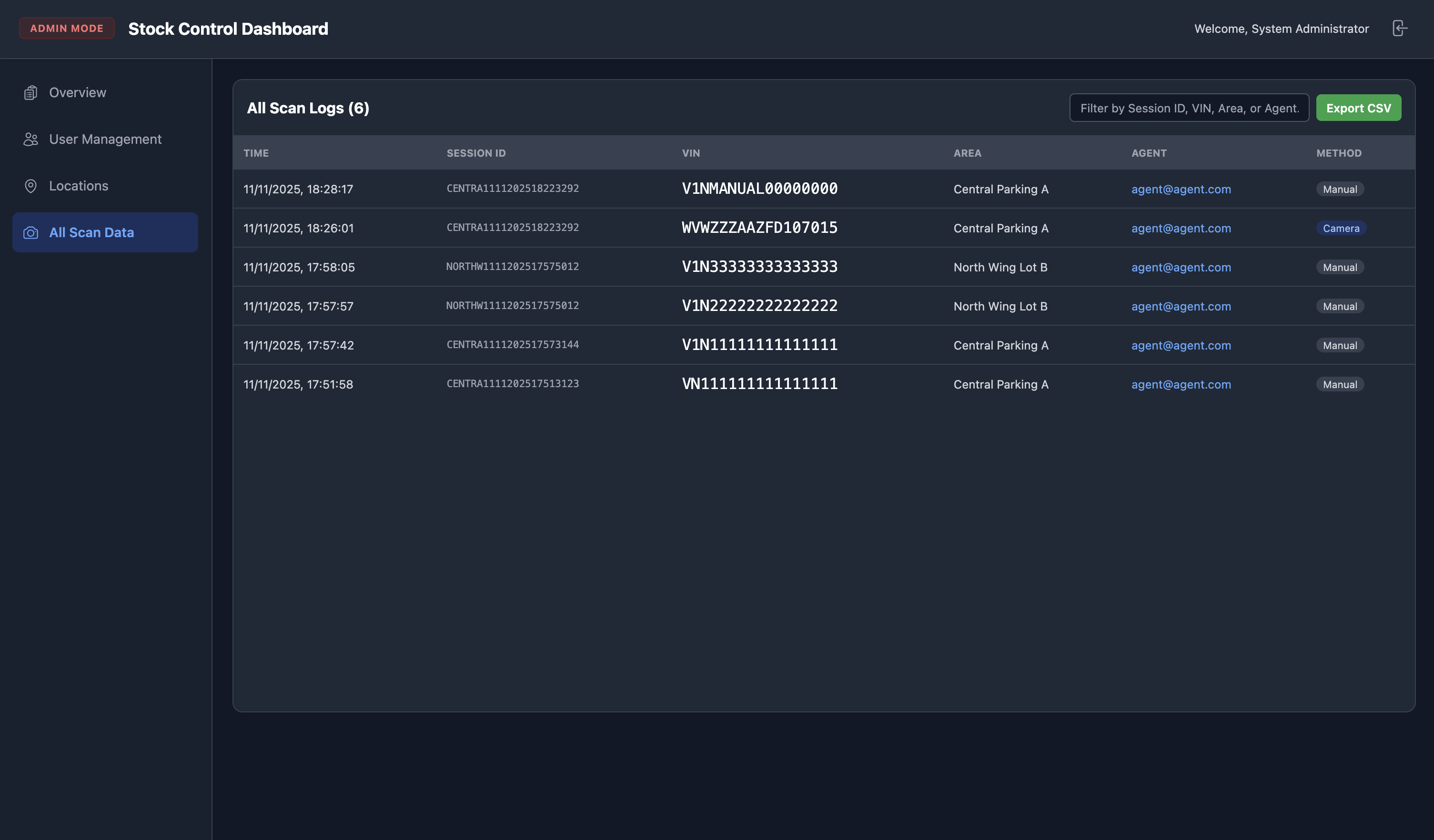 - Log de Auditoría "All Scan Data": Un registro inmutable de cada VIN escaneado, detallando hora, Session ID, VIN, localización, agente y método de captura.