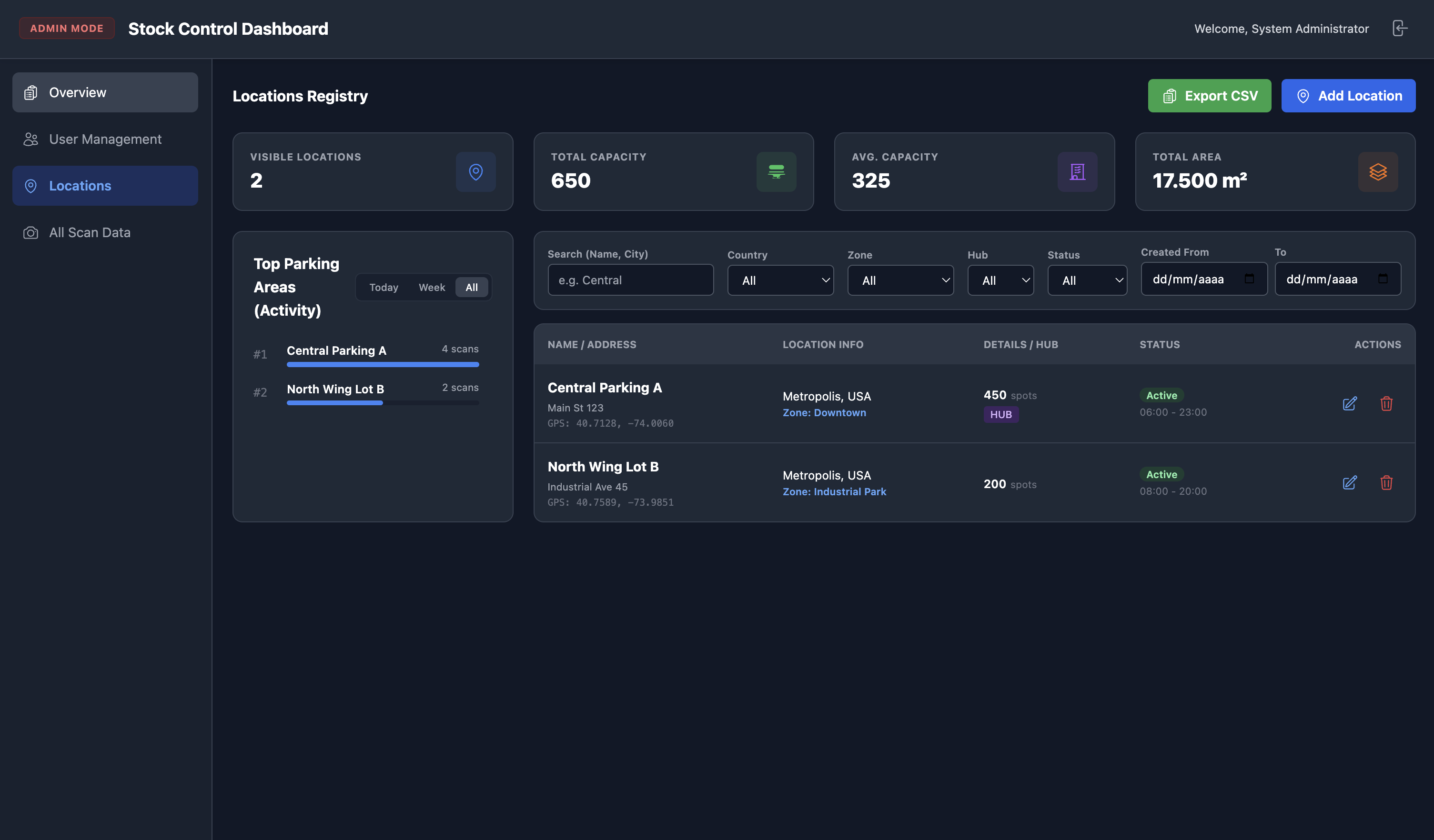 - Gestión de Localizaciones: Permite crear, editar y filtrar parkings o zonas. Se puede configurar la capacidad (en m² y en unidades) y su estado (Activo/Inactivo).