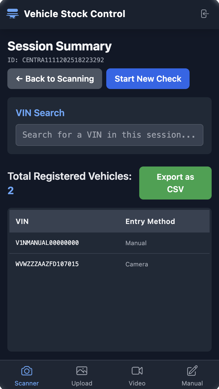 - Revisión de Sesión: El agente puede ver un listado de los VINs que ha registrado y exportar su sesión a CSV desde el móvil.