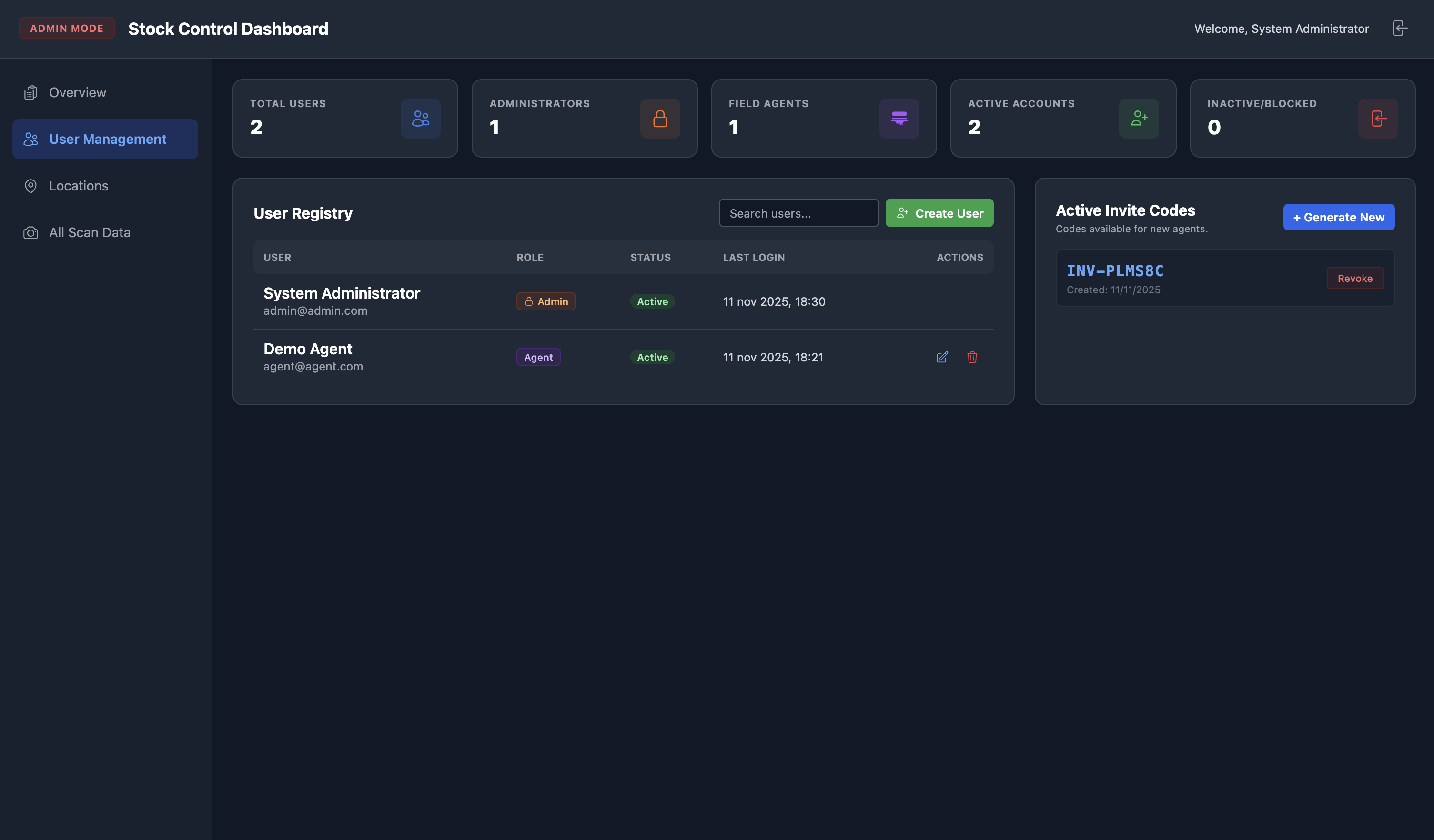 - Gestión de Usuarios: Control total sobre quién accede a la app. Incluye creación/revocación de códigos de invitación, activación/desactivación de agentes y asignación de roles.