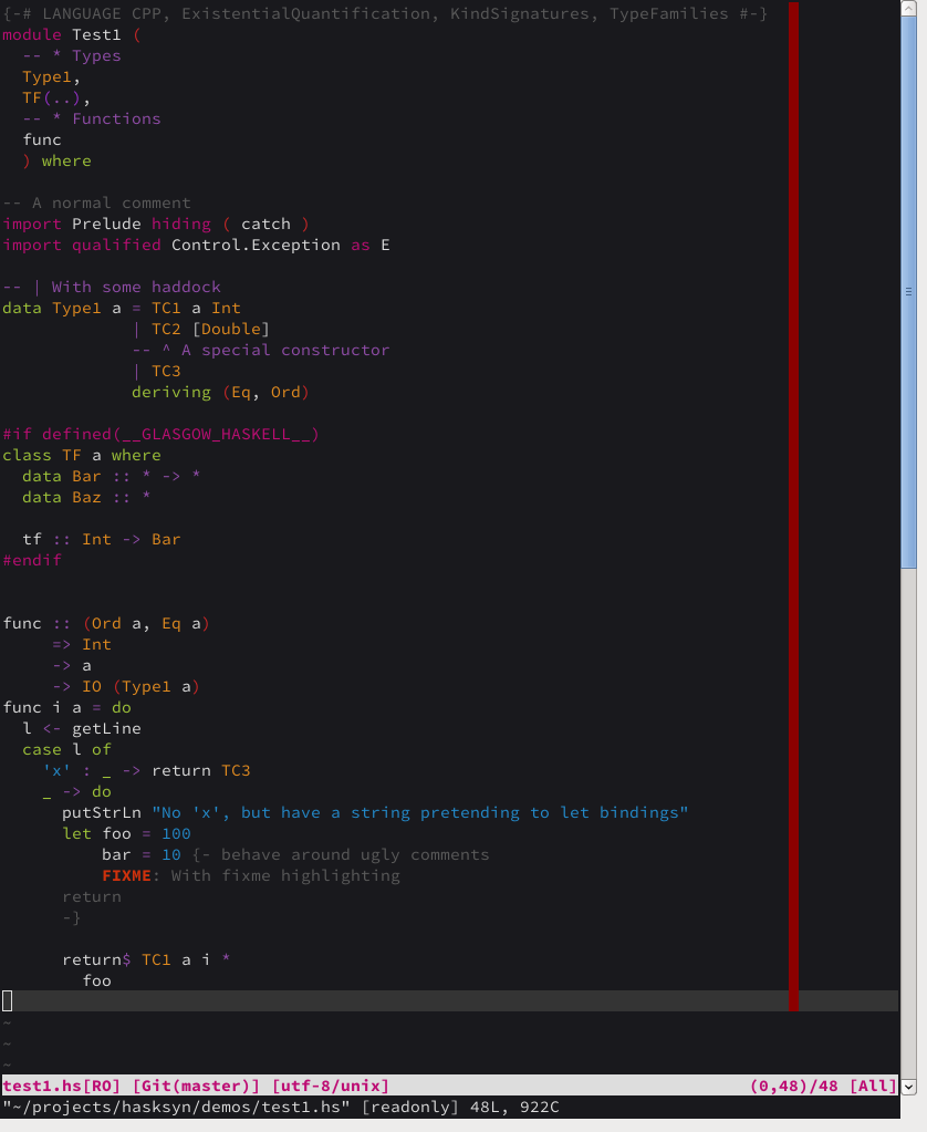 hasksyn is a vim plugin to highlight and indent Haskell source code. It is written almost entirely from scratch and has slightly different goals than the original Haskell syntax highlighting code. Most importantly, this version explicitly does not handle Literate Haskell files at all. In exchange, it provides more comprehensive syntax highlighting for normal Haskell code, along with fairly reasonable indentation. It also includes improved highlighting for cabal files.