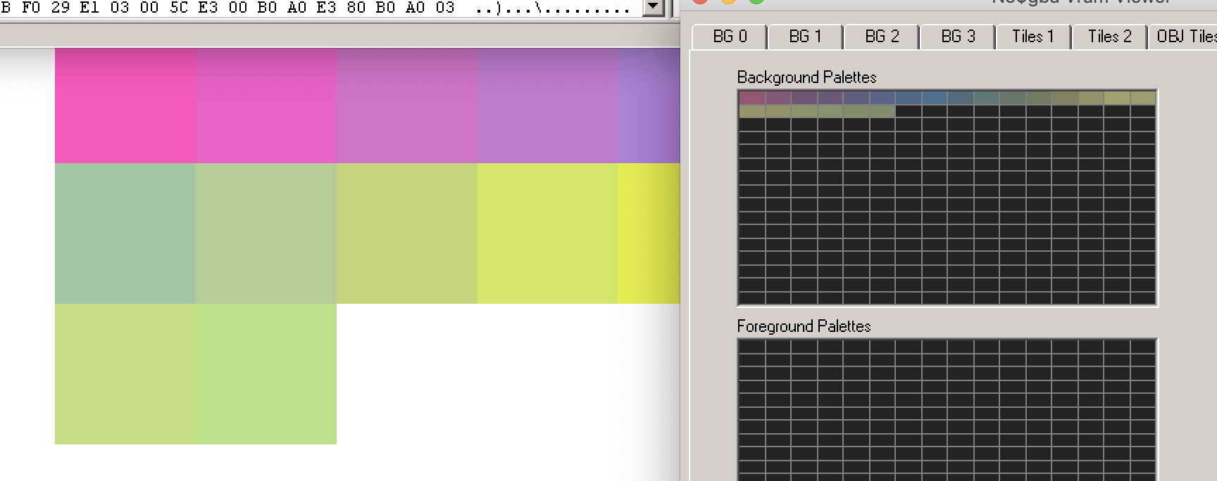 As you can see, our palette in the browwser is way brighter than the resulting one in no$gba; this is not because no$gba has a weird colour correction… but the GBA screen has some gamma correction we need to emulate (and nocash does it pretty well)