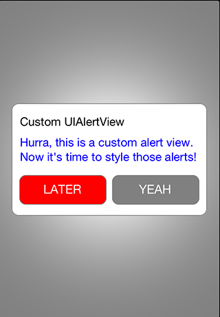 - (UIView *)backgroundView;That's it. Don't worry about frames and all that, just provide desired labels/buttons/background view. Since it's a subclass of UIAlertView it can be used as such: