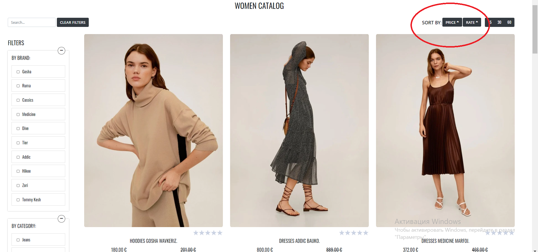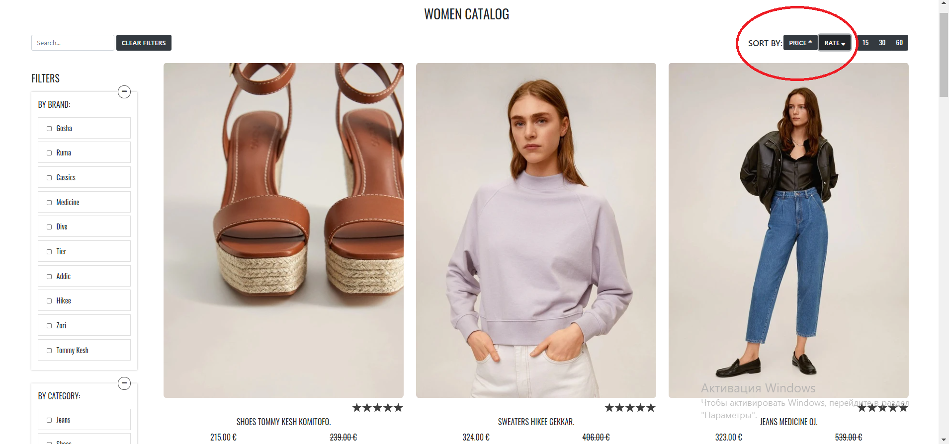 Button 'Price' is in a normal state with 2 arrows. Button 'Rate' is with an arrow pointing up. Products are sorted by rate in ASC.