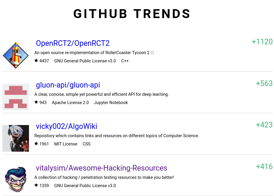 - Pros: select trending repos per programming language e.g. top trending haskell
