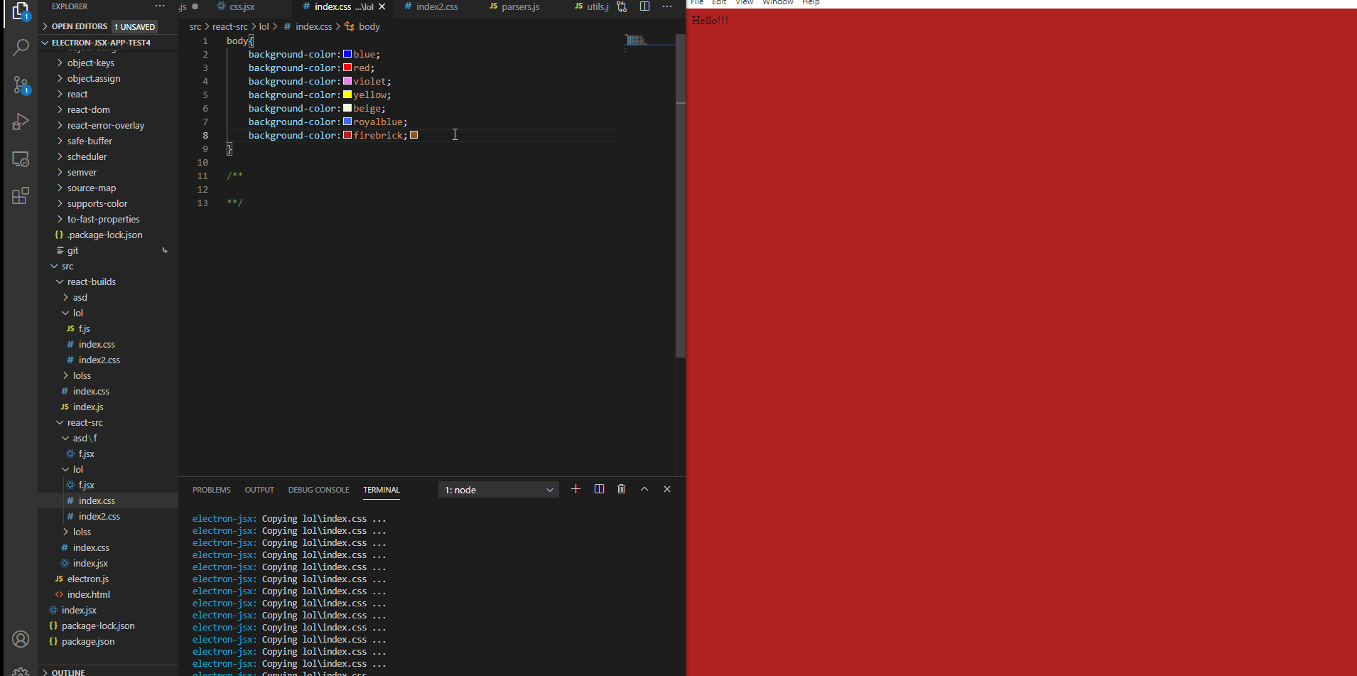 electron ./src/electron.jsYou should automatically see a react-builds folder with all your files transpiled inside And if all its ok, you can see the react app in the electron window... (Be patient, things don't always work out the first time)
