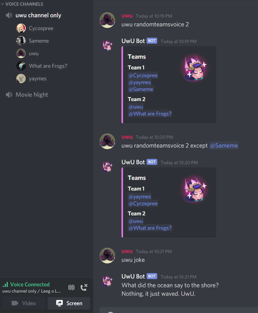 A discord.js bot for a League of Legends Discord server that plays music, tells jokes, and generates random teams from people in your voice call for playing custom LoL matches.