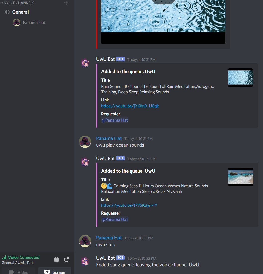 If you want to set uwu-bot up locally, install node.js, clone the repository, and in the highest directory (same directory where your index.js file is), add a file called ".env" which will have your discord token and youtube key.