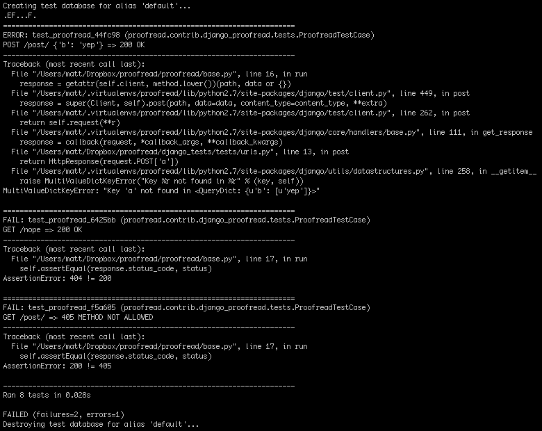 After configuring which urls Proofread needs to check, you're ready to run your tests. Proofread acts just like normal Django tests, so you can just run: