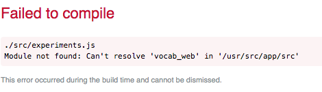 Attached: Error message photo that reads "Failed to compile. './src/experiments.js' Module not found: Can't resolve 'vocal_web' in '/usr/src/app/src'.