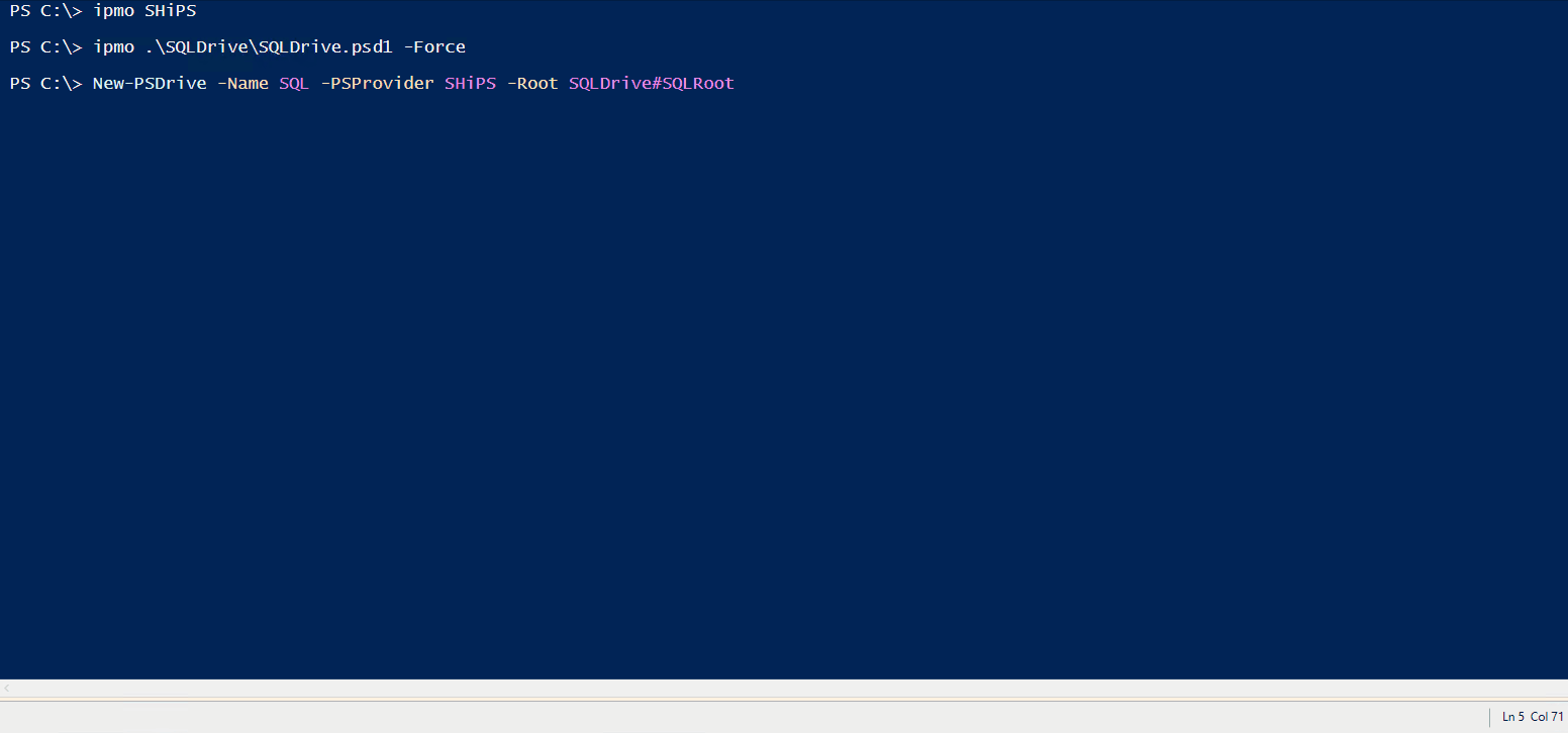 SQLDrive This is an experimental version of SQL Server as PowerShell Drive using the SHiPS module. Usage Import-Module SHiPS -Force Import-Module .\SQLDrive.psd1 -Force New-PSDrive -Name SQL -PSProvider SHiPS -Root SQLDrive#SQLRoot Current State Demo