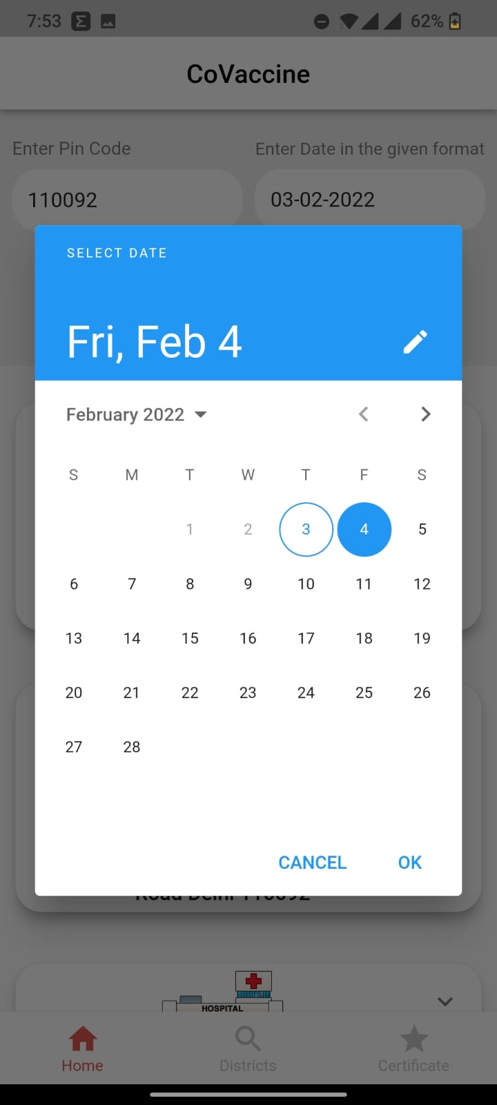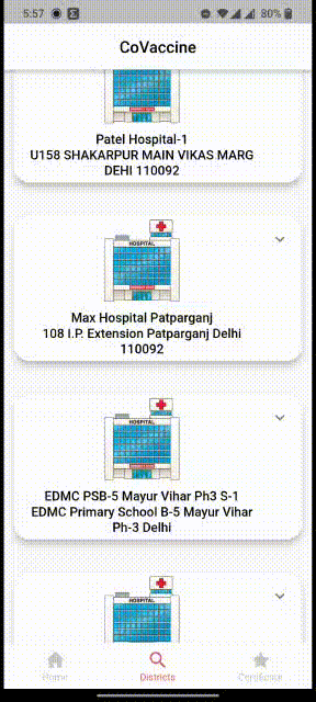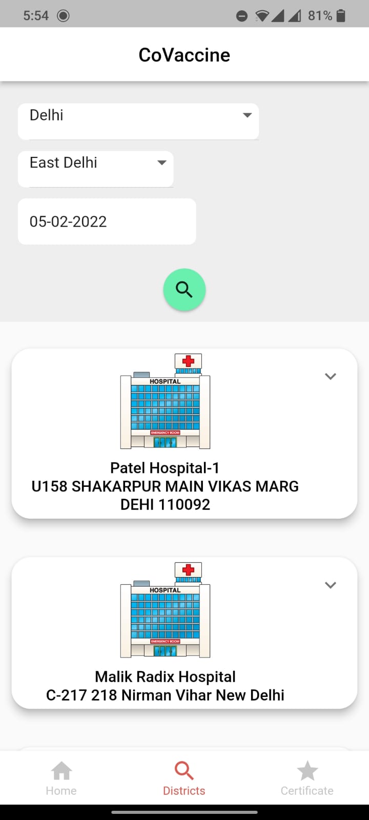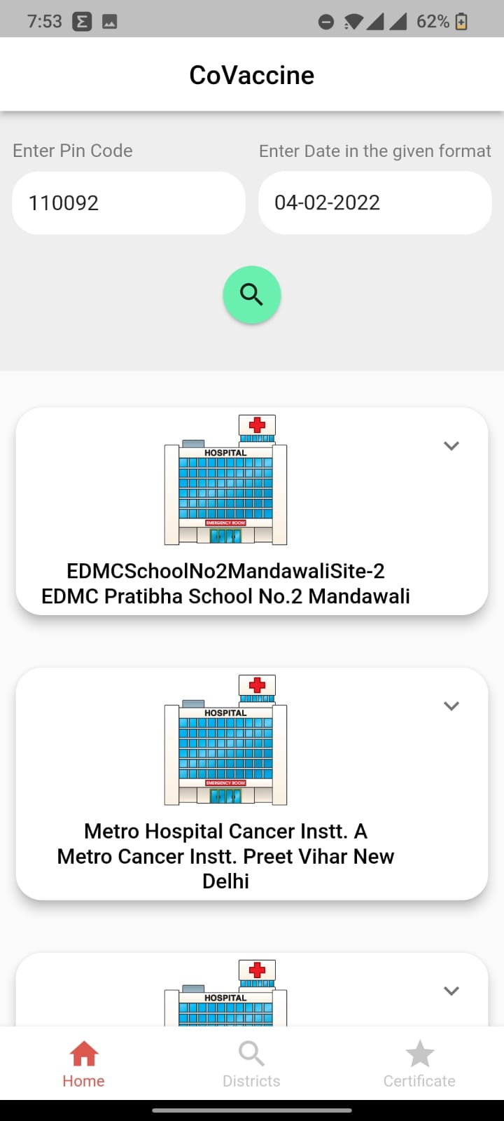 A Flutter app which lets the user see nearby vaccination center using Pincode or State and District along with date.The app also helps the user navigate to the centers by directing them to google maps. User can also download their vaccination certificate using their beneficiary ID. This app uses the Indian Governments Cowin API to fetch the data, hence this works only in India.