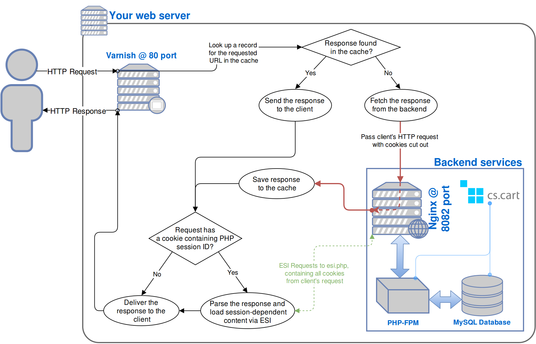 - Guests with a session started have a session cookie and get only the main content of the pages from the cache. The main content is session-independent. Varnish loads the content of session-dependent blocks (like Cart content or Wishlist) dynamically via ESI from PHP backend when building the page before sending it to the client.
