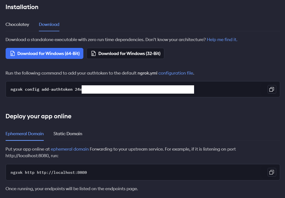 - 在儀表板上方,依作業系統來選擇下載 zip 檔,裡面是 ngrok 執行檔,並解壓縮到指定資料夾路徑:
