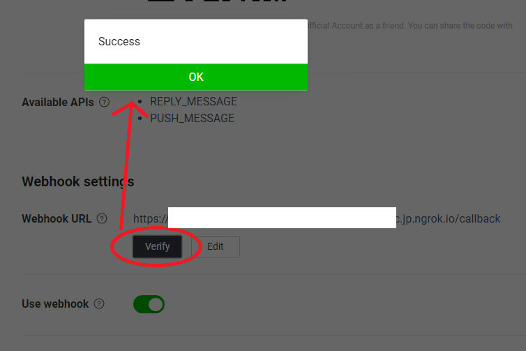 Channel secret和Channel access token複製貼上到專案資料夾裡面的config.py當中 - 設定 Webhook URL,並驗證 (verify) 是否請求成功 (success)。