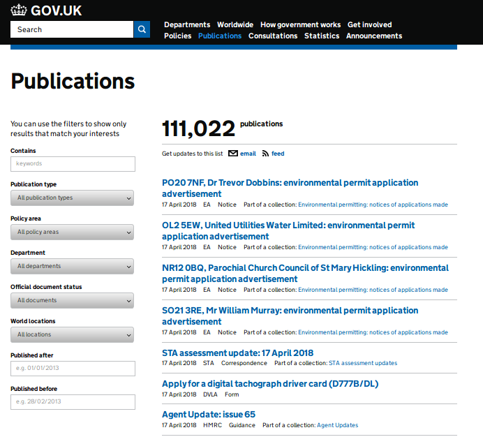 This package is designed to automate the download of documents from the main repository of documents on the official UK government website. Unfortunately, no API is currently available and the datasets available on data.gov.uk provide only a subset of information that is published by the government departments and agencies. On top of that, the website uses JavaScript which prevents from using simpler RCurl-based scrapers. Thus, this package has to rely on a less-then-ideal approach of using RSelenium, R bindings for Selenium WebDriver. This solution is not as stable it would have been with RESTful API or static website, due to a larger number of moving parts, but it's the only way to automate the arduous task of pointing and clicking on the official website if you have to collect more than a handful of documents.