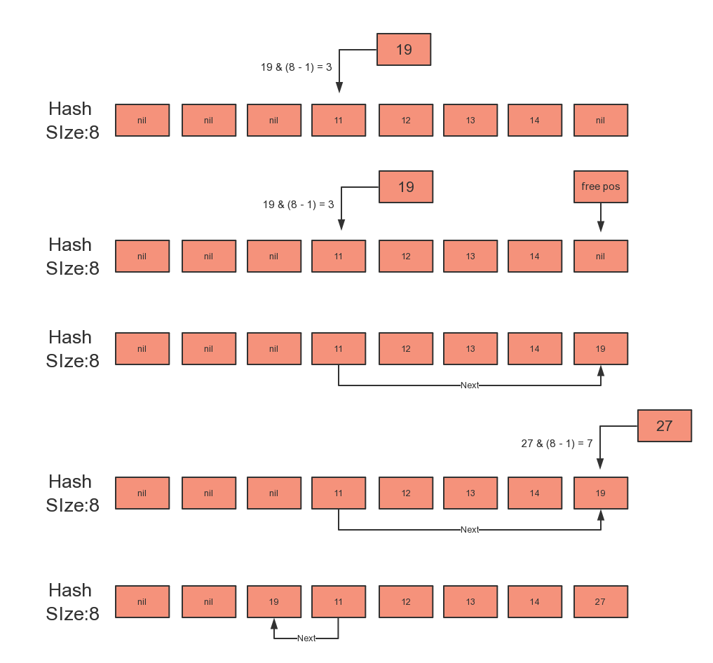 Hash Table 中用到闭散列,也就是发生冲突的节点存储在表的另一个槽内,由 nk 指向下一个节点;其中的 next 是根据当前节点的偏移,可正可负;