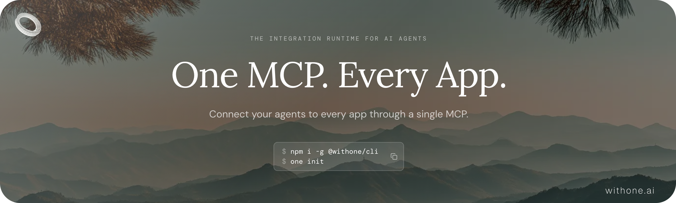 one initThat's it. The One CLI will prompt you for your API key (get one from the One dashboard) and configure the MCP server for your environment: Claude Desktop, Cursor, Claude Code, Windsurf, or any MCP-compatible agent.