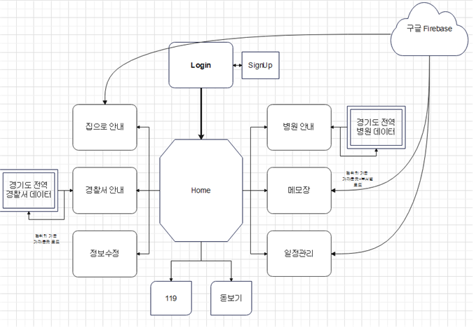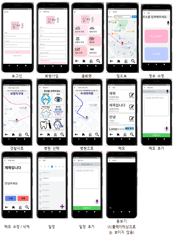 ‘집으로 안내’를 클릭하면 파이어베이스에 저장된 주소를 받아 집으로 이동하는 경로를 알려준다. ‘병원 안내’는 희망하는 부서를 입력하고, 입력받은 부서에 맞게 병원 위치 데이터를 토대로 현재 위치에서 가장 가까운 병원을 안내하게 된다. ‘경찰서 안내’는 병원과 마찬가지로 현재 위치에서 가장 가까운 경찰서ㆍ파출소의 위치 경로를 안내한다. ‘메모장’은 노인분이 메모를 추가하여 그 메모들의 리스트를 파이어베이스에 저장하고, 이는 보호자와도 연동이 되어 노인분이 생각하지 못한 메모 내용을 보호자가 추가해 줄 수도 있다. ‘정보 수정’은 자신의 집 주소를 파이어베이스에 저장해 ‘집으로 안내’시에 사용하게 된다. ‘일정 관리’는 선택 날짜의 일정을 입력받아 메모와 비슷한 형식으로 저장이 된다.